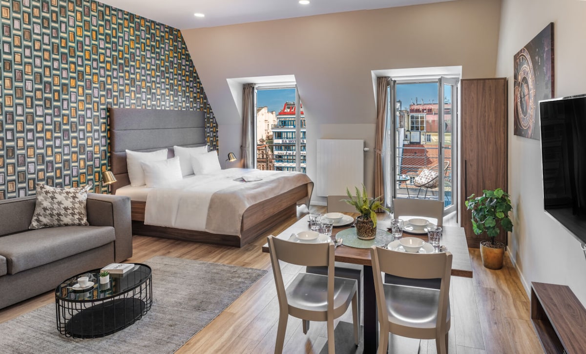 This modern studio offers 39 sqm of space across one bedroom. Ideal for up to three adults, its fully-equipped kitchenette, workspace and king size bed makes this stay a perfect way to experience Prague. The studio also offers a sofa bed and modern bathroom, so you’ll have everything you need for maximum comfort and minimal stress. But that’s not all—you can’t forget about the central location, Prague’s Old Town (Staré Mesto)!