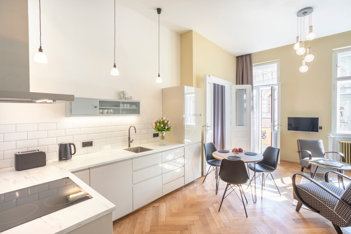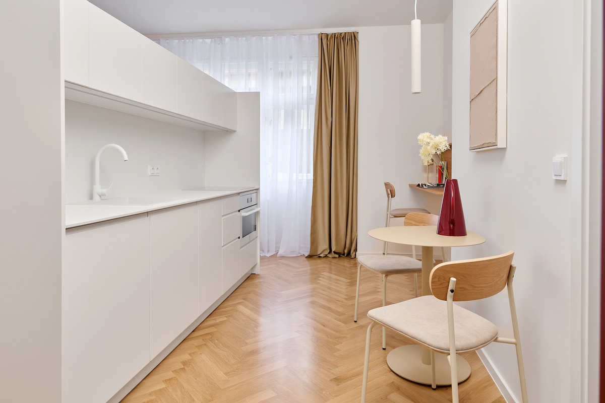 This charming, tastefully renovated three-room apartment (kitchen/diner, sitting room, and bedroom) is in an Art Nouveau building in Vinohrady (Vineyards), one of Prague’s finest and most prestigious neighbourhoods. Unfortunately, the property isn’t suitable for infants or children under 15. If a child is over 15, they’re a fully paid guest, allowing only one extra adult guest.