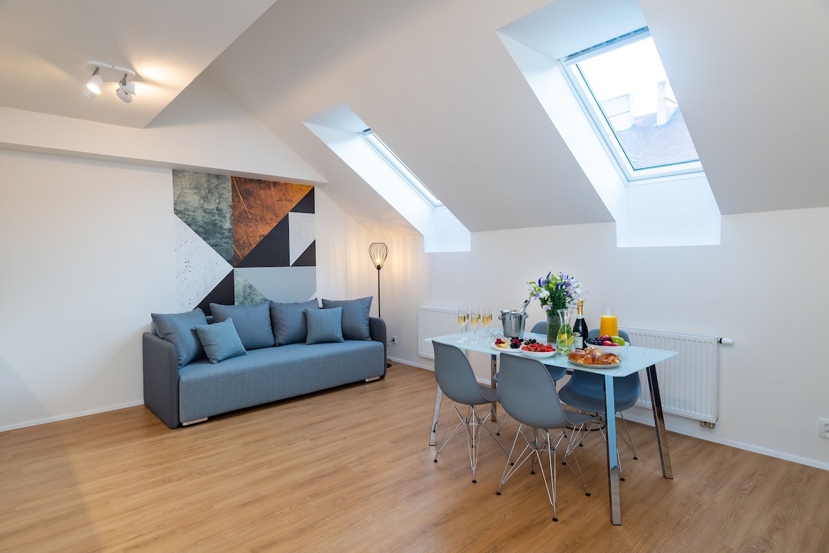 Komfortní a stylový půdní byt pro vás bude tou nejlepší základnou pro objevování kouzelné Prahy. Bulvár na Příkopě, Václavské náměstí, Staroměstské náměstí a všechna další významná místa jsou vzdáleny jen několik minut chůze. Vzdušný prostor obývacího pokoje vám kromě moderního vybavení nabídne také úchvatný pohled na panorama historické i moderní části Prahy. Byt je velmi dobře dobře dostupný z Letiště Václava Havla, Hlavního vlakového a Autobusového nádraží