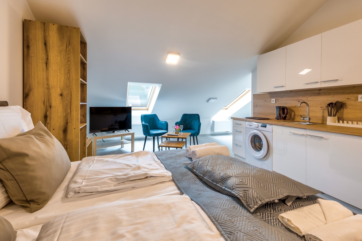 65sqm luxe studio (45+20 private balcony with scenic hill view) is ground-zero for sleek sophistication; industrial tone and luxurious amenities - the most unique architectural project in Czech Republic! Relax in 20m indoor pool, sauna, gym, massage room, and movie room Upstairs loft with private meditation/yoga room A real king bed with thick mattress and US bedsheets; full kitchen Conveniently at bus stop (U Belarie) 10min walk to riverside restaurant
