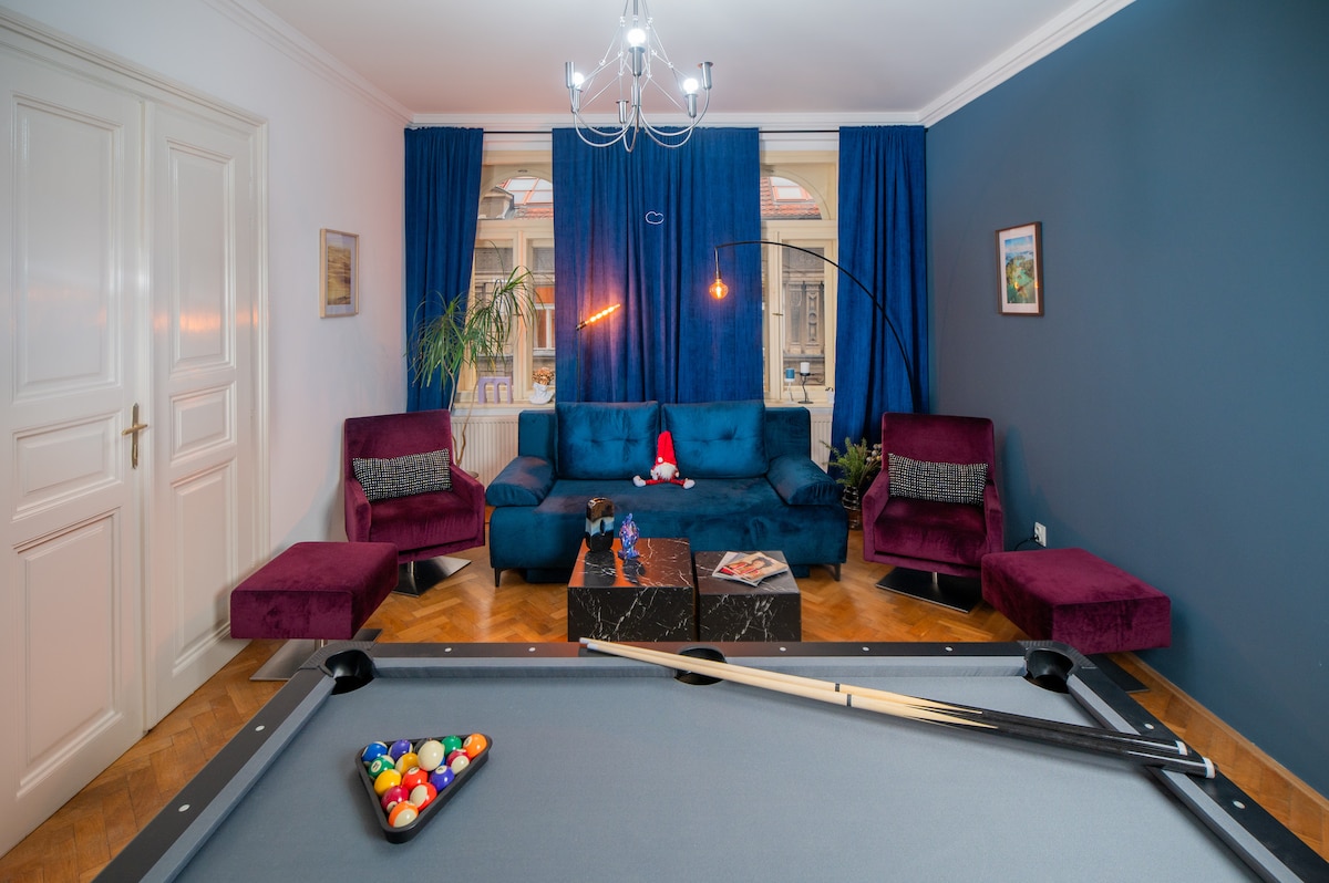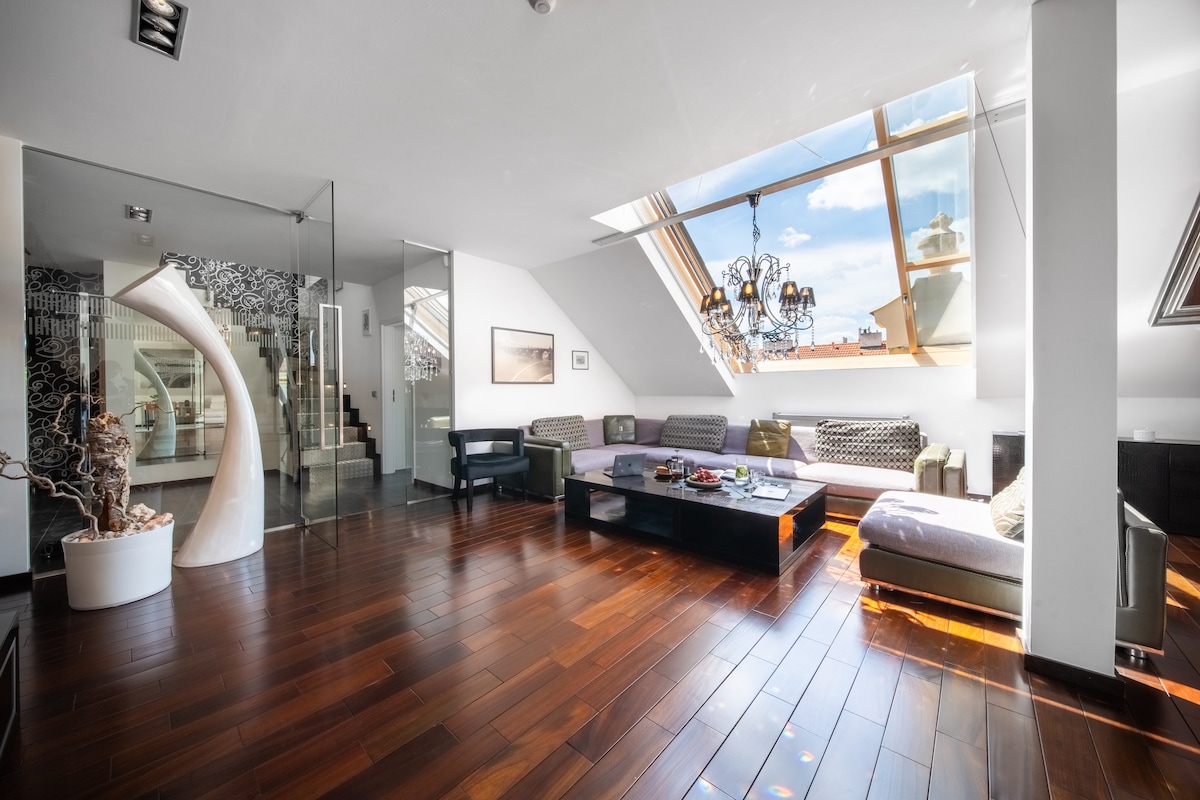 2023 Finalist of TOP Modern-Classic Design competition. Stay in the most stylish apartment which you have ever seen. Please note - NOT a PARTY apartment. The best location: - 2 min from National Museum and Wenceslas' square. - 3 min from the main train station. - 1 min from the most beautiful Riegrovy sady park. The equipment - watch movies in home cinema quality - giant screen - relax in infra sauna The design - carefully selected elements and furniture underlining the historical style