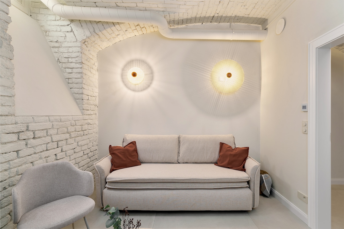 Уютный дизайнерский апартамент с сауной и проектором в центре Праги. Добавь в избранное, чтобы не потерять. Роскошный белоснежный интерьер с историческими сводами, стильная гостиная, приватная сауна и кино прямо над кроватью. Идеально для романтического уикенда, перезагрузки или спокойного отдыха. Расположен на тихой улице Sevastopolská — в шаге от лучших мест города.