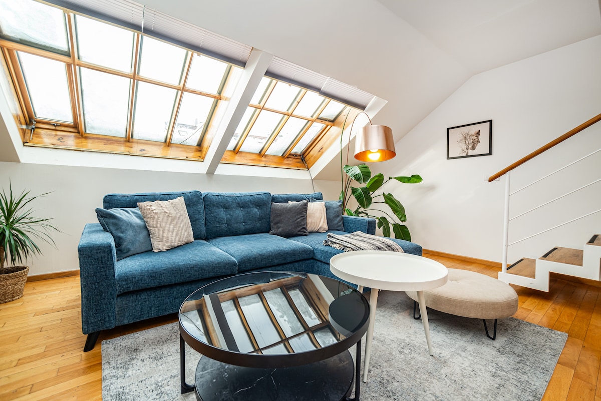Snuggle up for a romantic night under a vaulted ceiling. This loft has been tastefully decorated with statement wallpaper in the bedroom area and boasts striking furniture that has been carefully selected to highlight the space. The bedroom is accessible by stairs. It has comfortable King size bed with quality mattress, chair and wardrobe. The living room is combined with kitchen and has large dining table. We will do our utmost for you to be delighted!