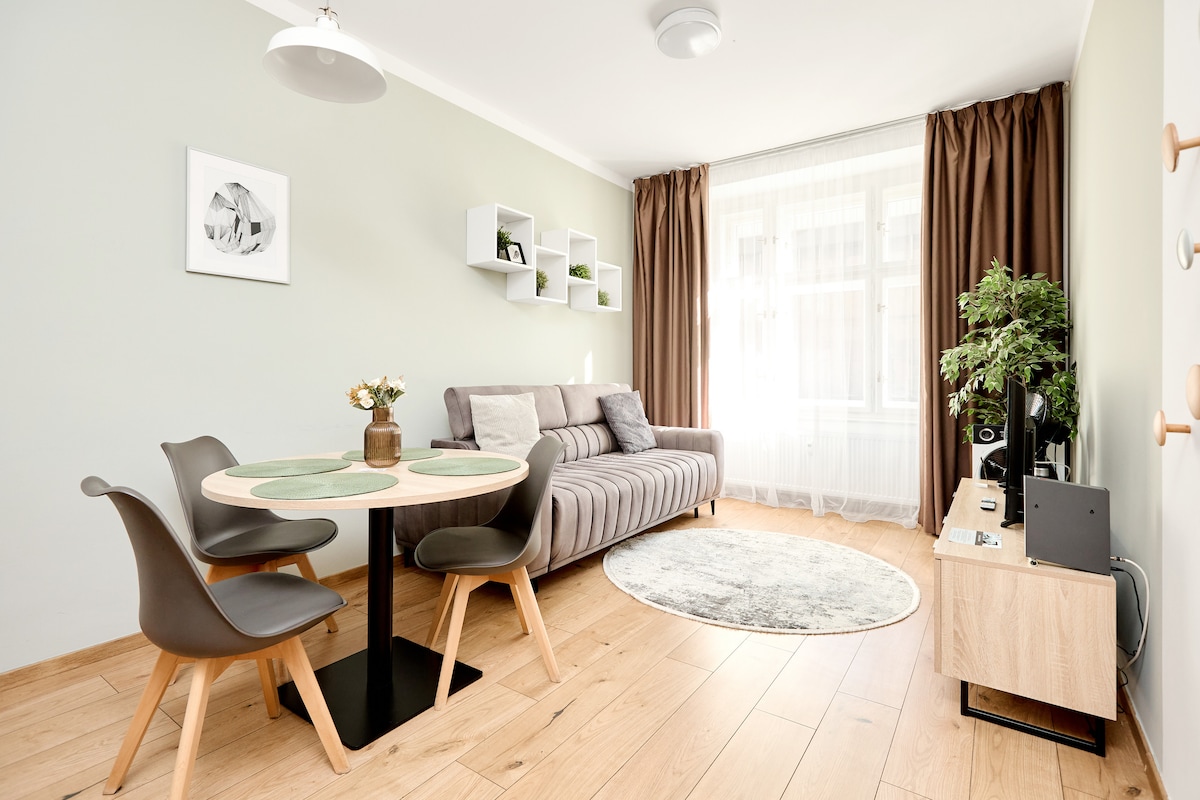 Experience the brand new stylish fully furnished apartments designed by renowned architectural studio Nedvěd Architekti where you can find everything from comfortable beds to towels and coffee cups. The carefully renovated building has preserved the best of history and added everything that modern housing requires. Make yourself comfortable! • 5 minutes to the heart of Prague • 80 meters to the nearest café • 1 stop from the main railway station • Steps away from metro and tram