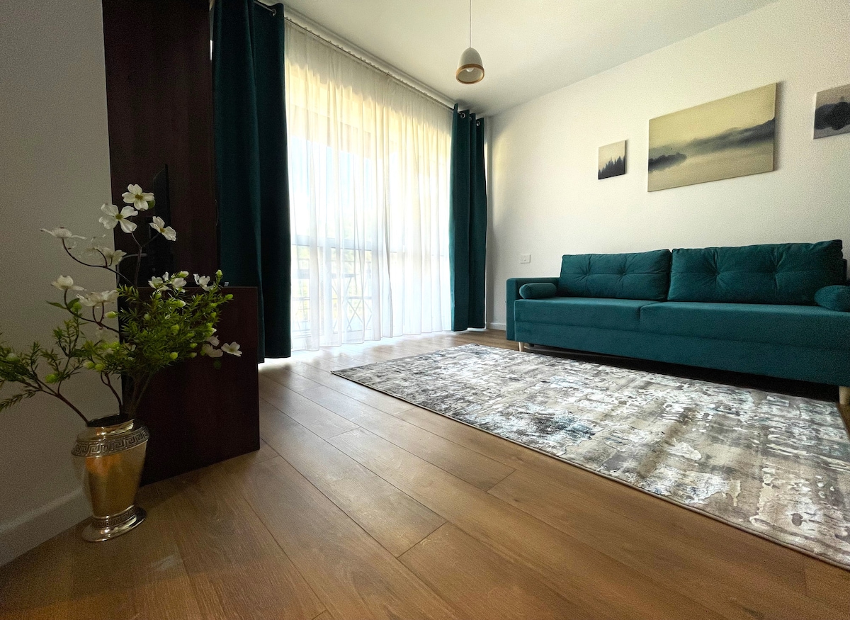 Delightful studio in a cozy and quite location between the mountains. The apartment has high-speed internet, fully equiped kitchen, a modern bath, a balcony with a splendid mountain-view and a private underground parking spot. The building and the home furniture are new. The apartment is professional disinfected after each visit. Smart home - easy access by code. SPA access (Pool & Sauna) at 20 eur/3h or 30 eur/day Restaurant & bar at ground level. The building is protected 24/7.