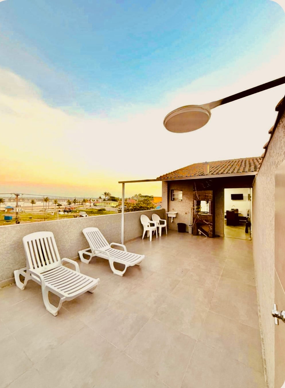 Maravilhoso apto duplex novíssimo pé na areia e vista mar ao lado da plataforma de pesca de Mongaguá. Acomoda até 5 pessoas: 1 suíte casal e 1 quarto para até 4 pessoas com 2 bicamas e varanda vista mar. Sala de estar, cozinha com fogão indução, geladeira, Microondas, airfryer, TV smart com Wi-Fi! Piso superior: área gourmet com enorme terraço na cobertura vista mar com ducha, churrasqueira r a carvão, cozinha e sala jantar. Pet friendly. 2 vagas de garagem. Jogos de cama e de toalha inclusos