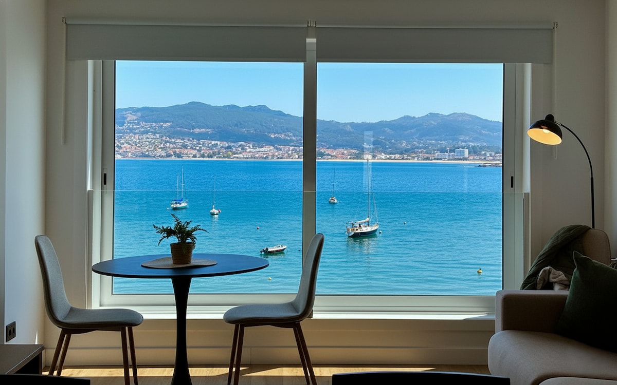 Seafront in Baiona: charming accommodation with modern amenities, bright bedroom with views of Baiona Bay and its beaches, panoramic living room, fully equipped kitchen, and bathroom with rain shower. Comfort and relaxation by the coast. It has an advisor. It does not have parking.