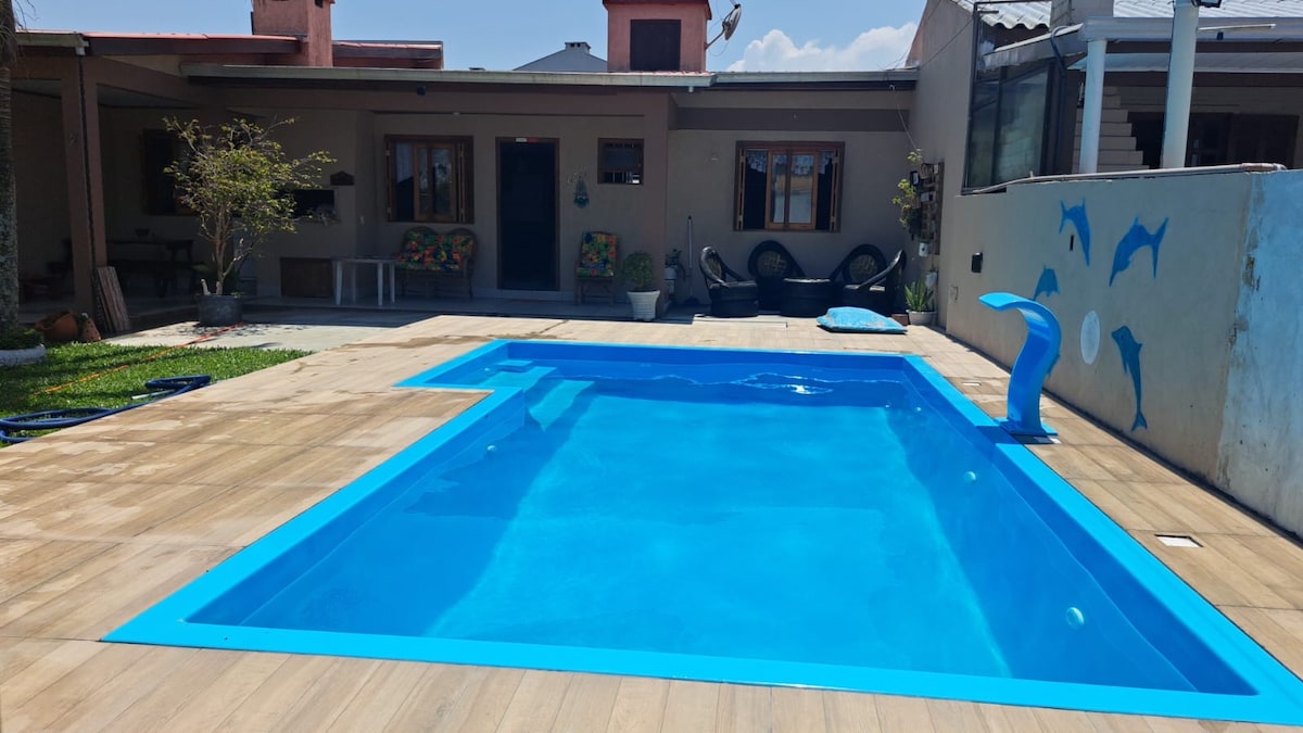FAVOR LER O ANÚNCIO. Casa localizada na Praia Real -Torres.Possui piscina com aquecimento SOLAR! Possui 5 quartos, sendo um suíte.A casa possui dois pisos.A parte de cima possui 2 quartos e 1 banheiro. A parte de baixo possui 3 quartos (1 suite) e 1 banheiro Possui máquina de lavar e uma bela churrasqueira.Todos os quartos possuem ar condicionado. No terreno dos fundos possui um quiosque equipado com mesa de sinuca, mesa de ping pong, mesa de carteado e pebolim. E no quintal uma rede de vôlei.