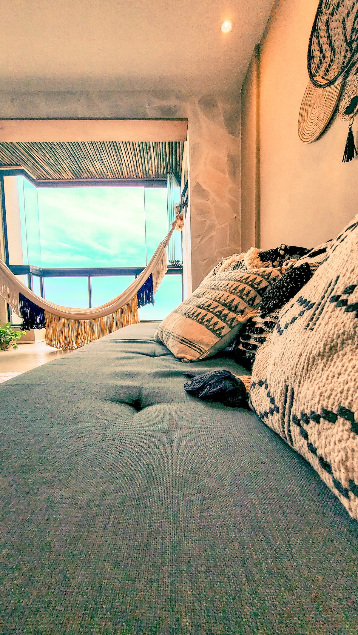 Conforto, luxo e tranquilidade. Isso você encontra em nosso apartamento que foi cuidadosamente projetado para lhe proporcionar uma experiência inesquecível com o MAR. Nesse ambiente arquitetônico clean, moderno, tecnológico e sofisticado você poderá usufruir da sensação de estar em um navio em alto mar. Você merece ter essa experiência! Sinta o cheirinho do churrasco com essa bela vista enquanto relaxa em nosso balanço panorâmico. Você não vai se arrepender!