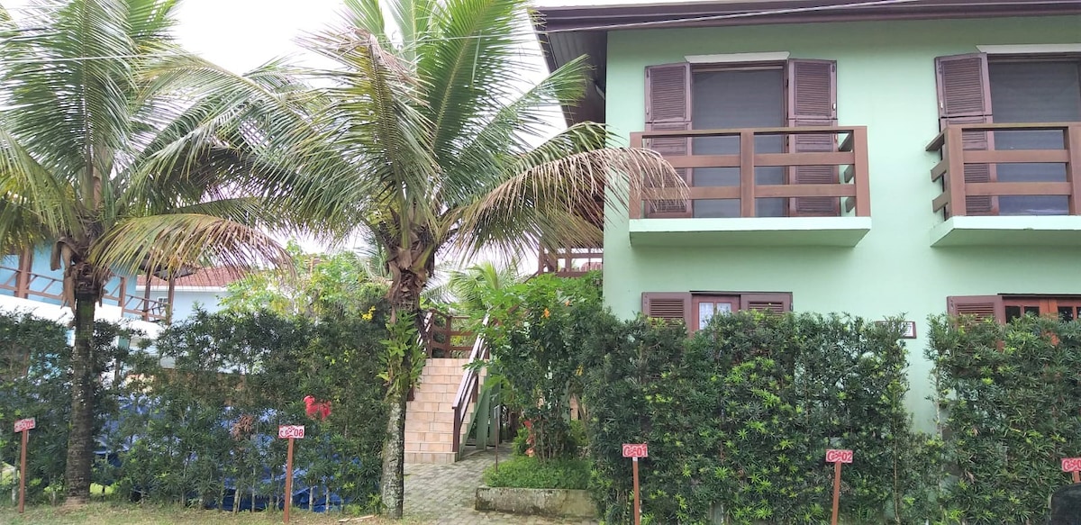 Espaço novinho, calmo e charmoso. Suíte com cama de casal queen , luzes de leitura e roupa de cama cheirosa. Uma cozinha com filtro de água, cocktop duas bocas e utensílios para o preparo de refeições. Varanda muito agradável, com mesinha, rede confortável e piscina a alguns passos de distância. Tudo feito com carinho para receber gente de bom-gosto em busca de tranquilidade. A serenata fica por conta da sinfonia da Mata Atlântica de Ilhabela , Uma da Ilhas mais bonitas do litoral brasileiro.