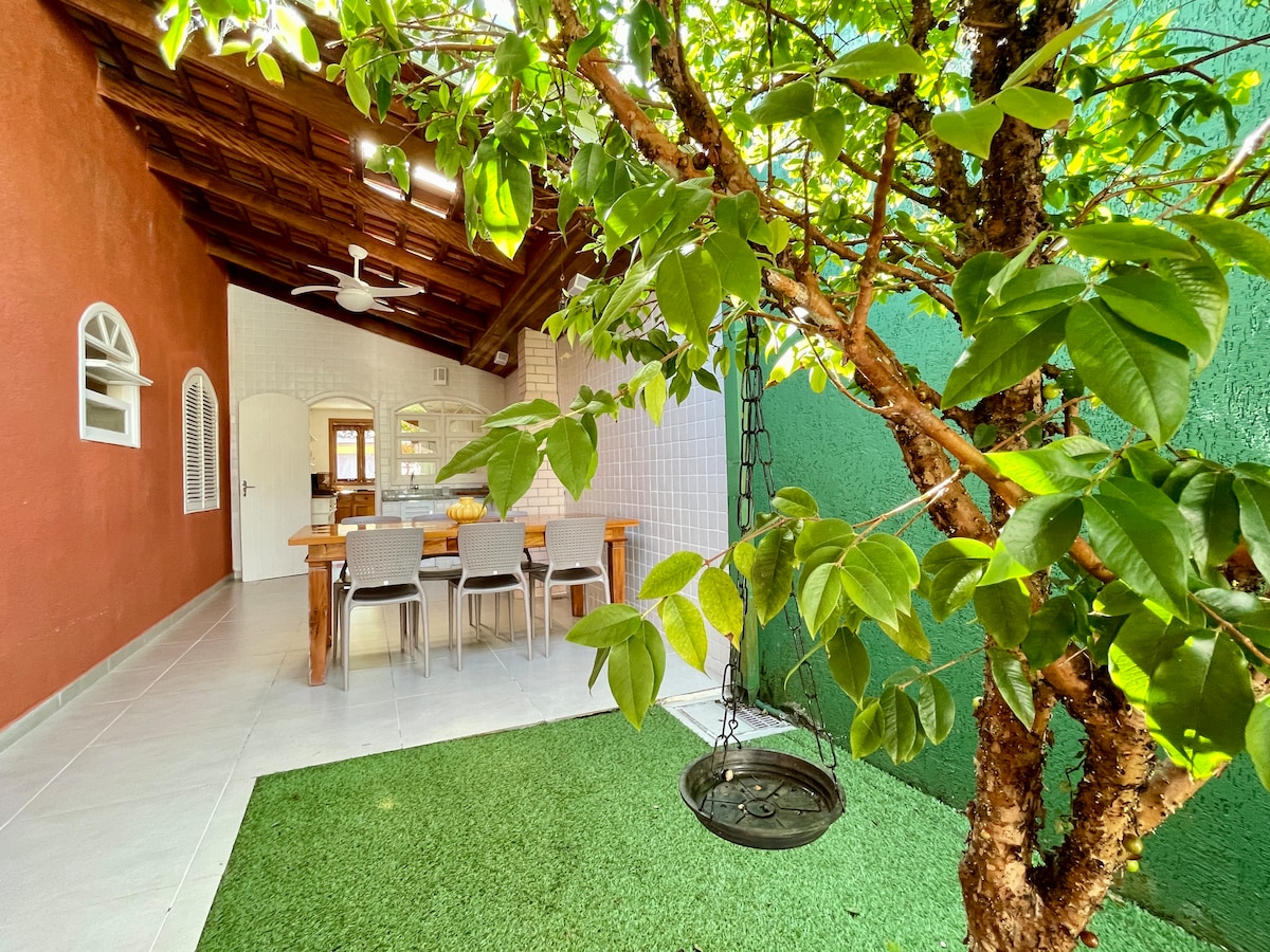Lindo sobrado em condomínio fechado com poucas casas a 50 m da praia. Com 4 quartos, sendo 2 suítes, todos com ar condicionado. A sala é integrada a um lindo jardim com um chuveirão e área de churrasqueira criando um ambiente delicioso para os hóspedes. A casa comporta confortavelmente 8 adultos, sendo bem equipada com eletrodomésticos, utensílios de cozinha, lavadora e secadora de roupas. Pronta para uso. O condomínio tem segurança 24 h, com 2 vagas de garagem e serviço de praia e piscina.