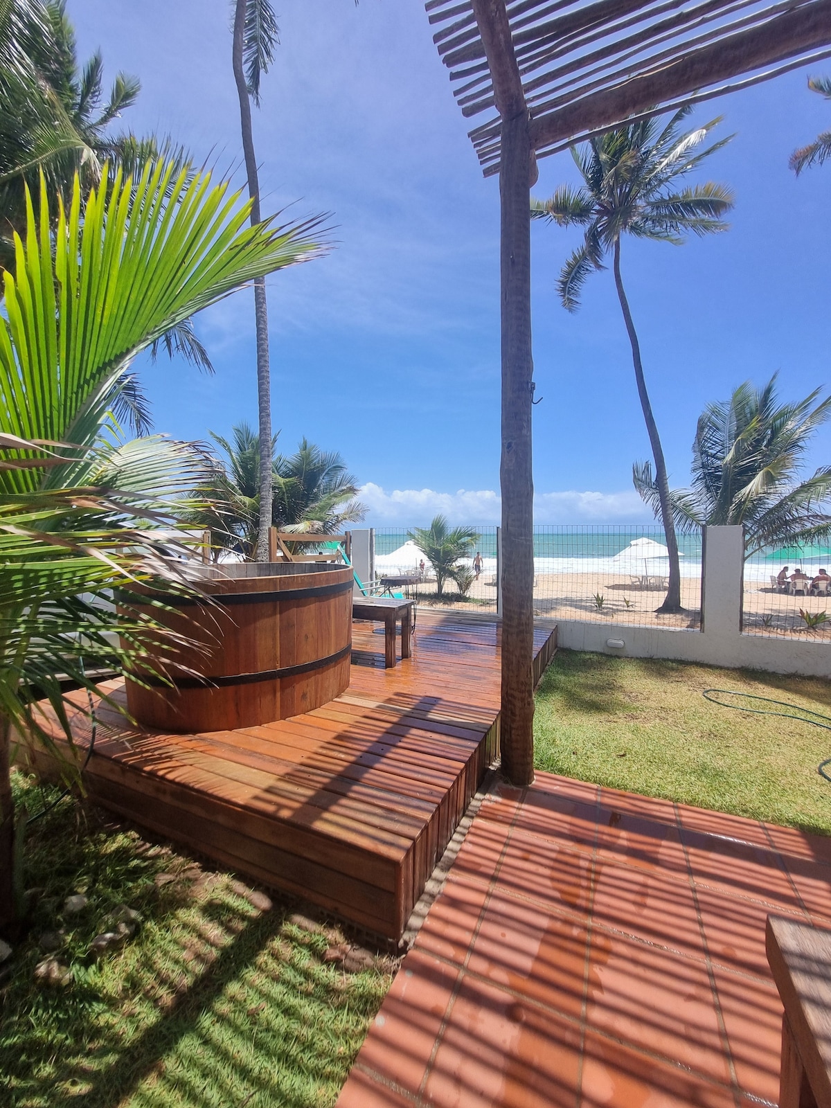 Casa rústica na beira-mar da Praia de Tabatinga recém reformada, com acesso privativo e a poucos passos da praia, com dois quartos sendo uma suíte, banheiro social, cozinha equipada, sala de estar e terraço amplo, com área de lazer incluindo piscina com cascata, hidromassagem e prainha, espreguiçadeiras, churrasqueira, gazebo com pia e bancada, mesa de jantar com bancos de madeira. Jardim iluminado. Terraço com móveis de madeira. Vizinho ao Tabatinga Arte Bar e ao Nord Luxxor Tabatinga.