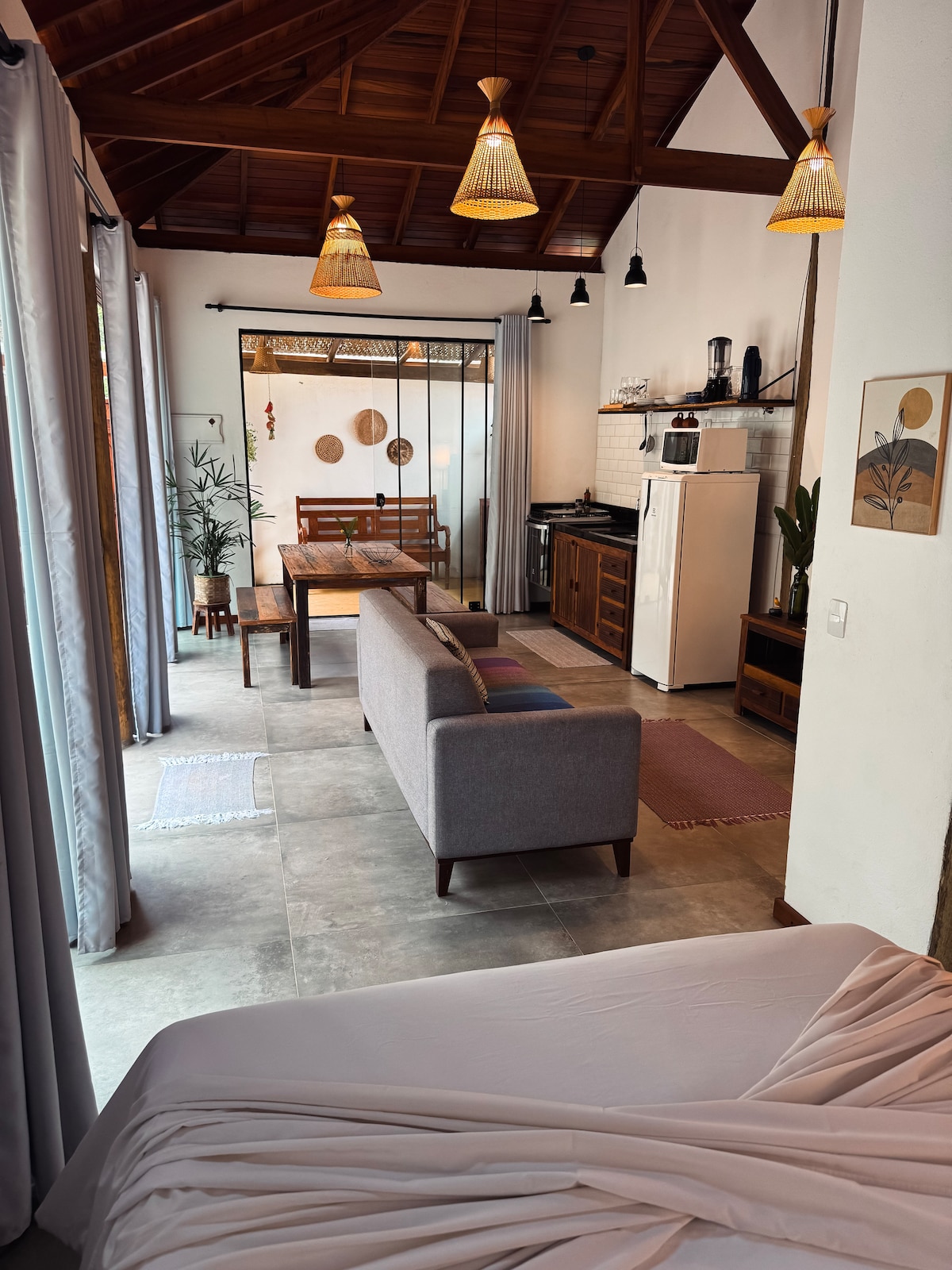 Um oásis no meio da natureza, mistura o campo com a praia. A casa é muito espaçosa, arquitetura rústica e aconchegante, no entorno silencioso. Bem montada para cozinhar, fazer churrasco, tem redes, lareira e jardim com ducha. Lugar perfeito para descansar, curtir a dois, com a família e com os amigos. A Praia Brava é um refúgio: pequena e com sombras das árvores! Águas tranquilas e as vezes dando espaço para o surf. O acesso é caminhando por uns 10 minutos. Deliciosa conexão com a natureza!