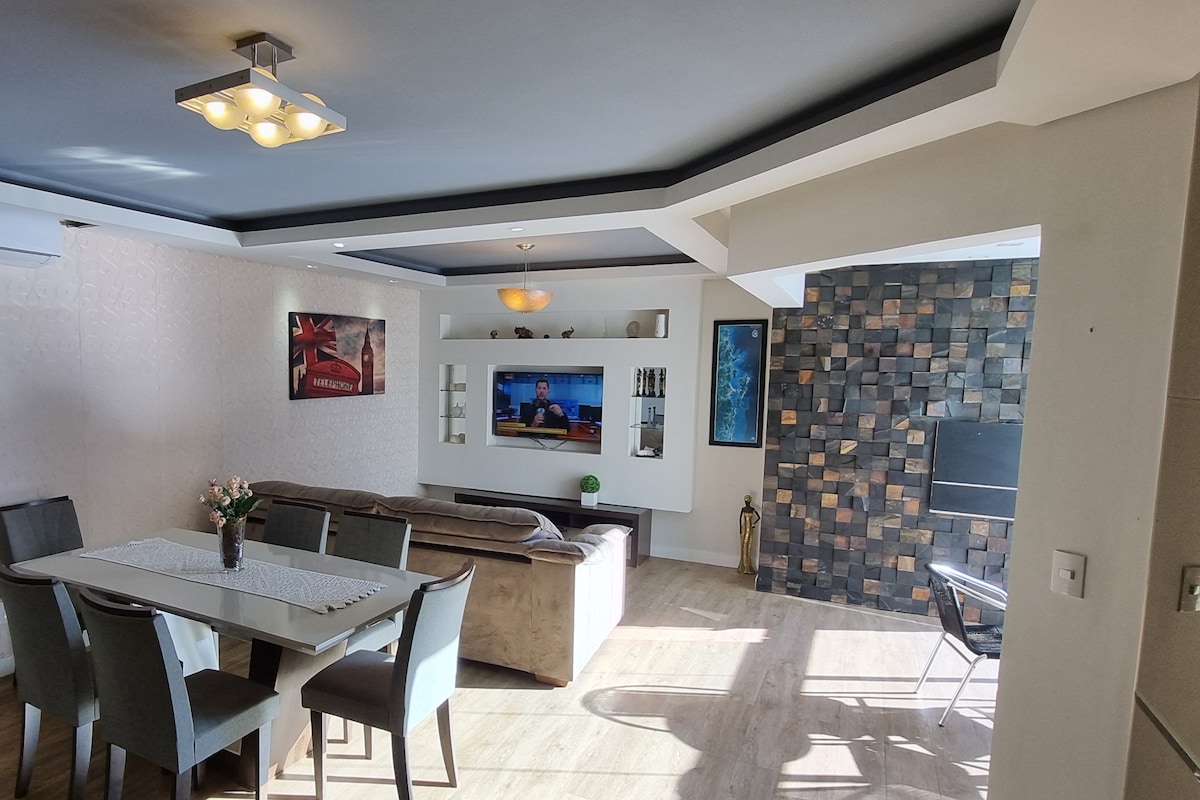 Cobertura de 3 suites, sala acoplada a uma ampla cozinha e terraço, perfeito para compartilhar momentos com amigos e familiares. Um local aconchegante e moderno, destinados a pessoas que buscam momentos de calmaria e lazer perto do mar. Localizado a poucos minutos das principais praias de Balneario Camboriú. Possui climatização em todos os cômodos e comoda até 9 hóspedes confortavelmente (3 camas queen, 2 colchões de solteiro e 1 sofá). Fica no 3 andar e o condomínio não possui elevador.