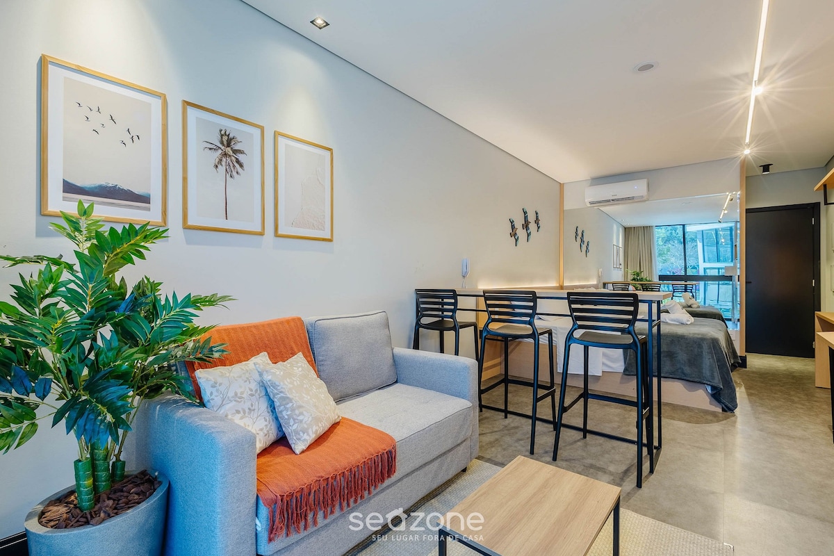 Nosso loft oferece uma experiência única, combinando conforto, vista espetacular p/ o mar e localização privilegiada. 🛏️ 1 quarto aconchegante com cama box queen (podendo colocar colchão de solteiro extra no chão) 🛁 Banheiro completo 🛋️ Sala com sofá cama (1,80m de comprimento, ideal para crianças) 🍳 Cozinha completa 📍 Frente Mar e próx. ao Brava Mall 📶 Wi-Fi e TV 🧼 Apto novo Ideal para casais e amigos que buscam uma estadia especial com o privilégio de estar de frente para o mar