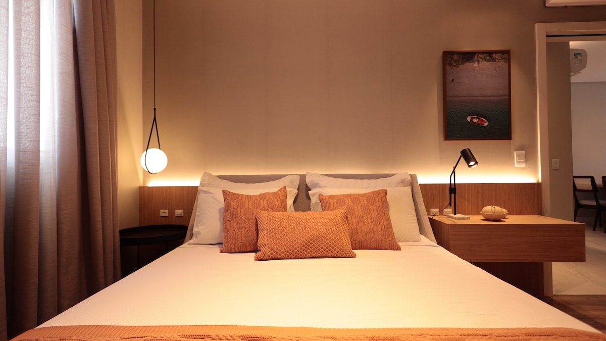 Luxuoso apto na Praia dos Amores ( Praia Brava) com vista ao mar e Morro do Careca. Ar condicionado/aquecedor em todos os comodos. TVs de 50 e 43 polegadas. Quartos com black-out. Aquecedores de toalhas. Praia fica a apenas 8 mins caminhando. Morro do Careca 12 mins até o topo. A roda gigante a 3 mins de carro. 2 vagas de garagem privativas. Comprimento: 4m e 65 cm Largura: 2m e 35cm Observe as regras da casa para confirmar que o apto se adequa ao perfil de sua viagem.