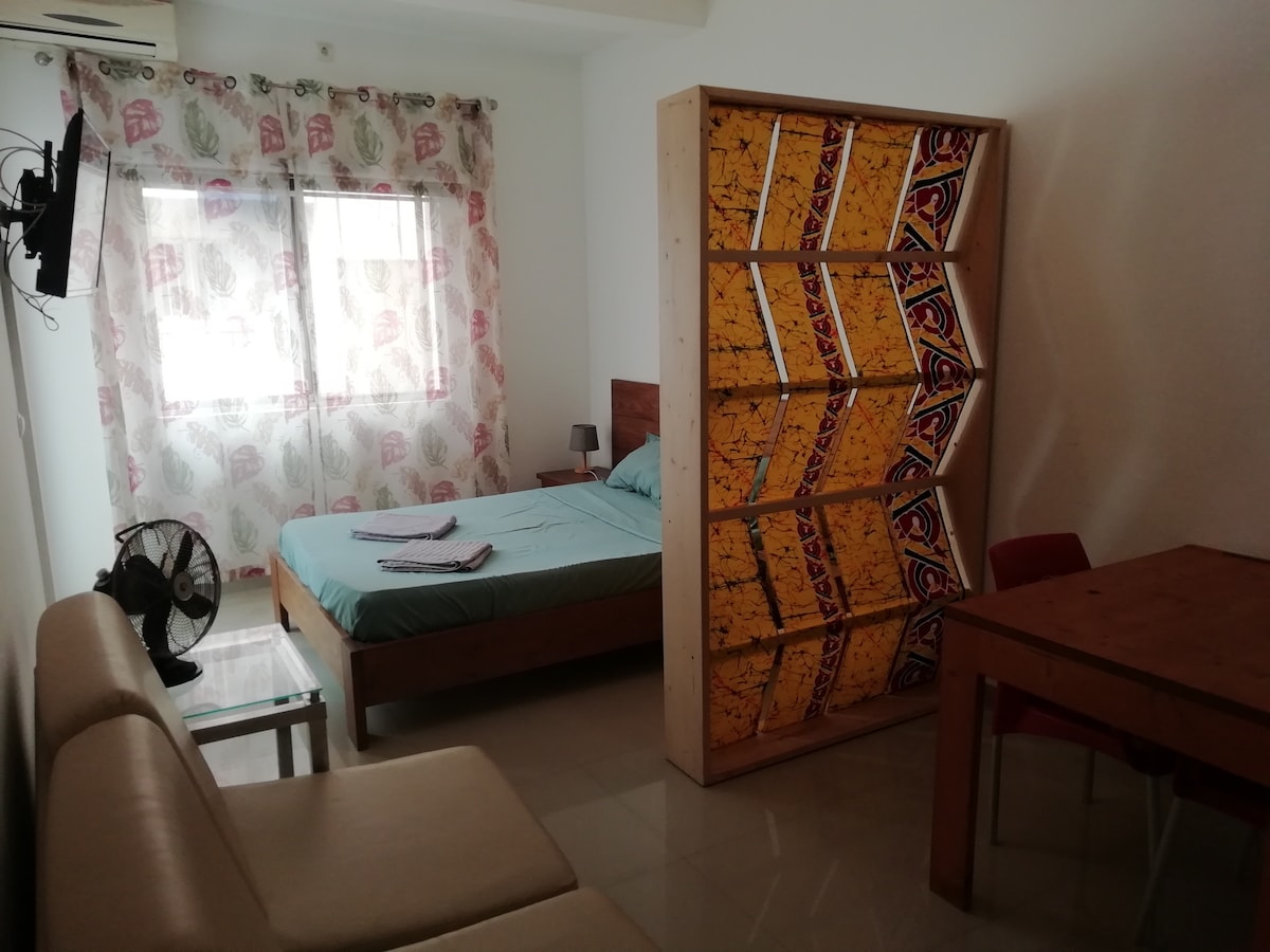 A cosy studio perfect for rest, at Tété family home. Hosts 2 people in the greatest comfort: double bed, clean towels and sheets, a closet and a desk, one bathroom and kitchen(not yet fully equipped). Free wifi is available at all times. The house is within walking distance of the beach, some shops and restaurants. We welcome you to feel at home in this privileged location.