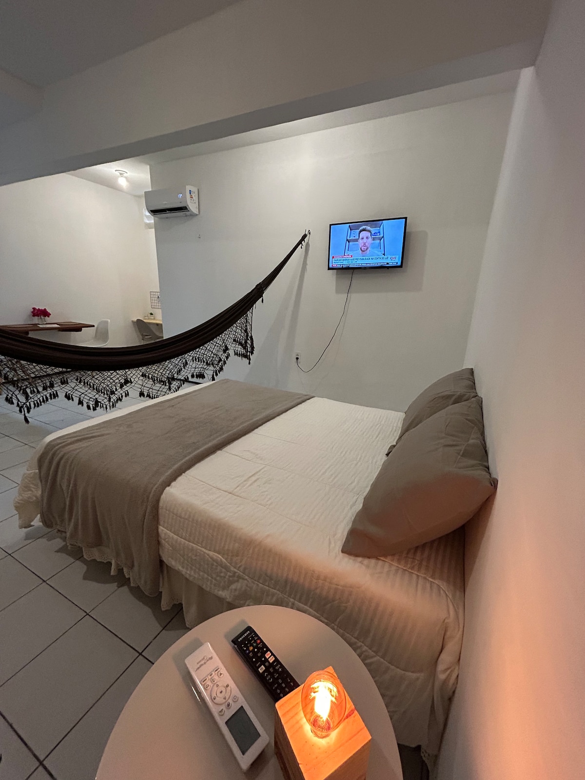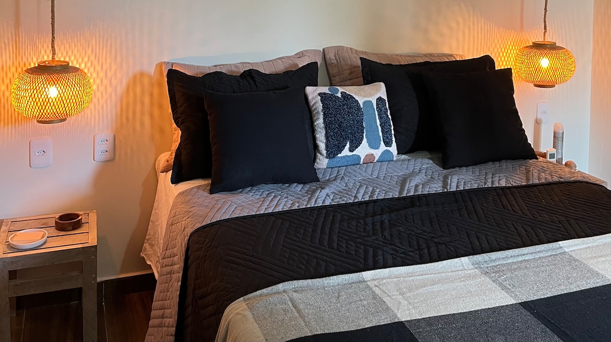 Elegante Suíte construída em contêiners maritimos. O Apartamento dispõe de uma suíte de casal com TV Satélite, internet com WI-FI, Ar condicionado, vista para o mar, frigo bar, chuveiro quente, estacionamento, e jardim. No térreo tem um pequeno quarto para descansar sem banheiro, uma varanda com uma área de lazer com geladeira, gela água, fogao, microhondas, utensílios, e Jarra Chaleira Elétrica. No mesmo terreno existe outra casa de aluguel por temporada completa de tudo necessário para morar.