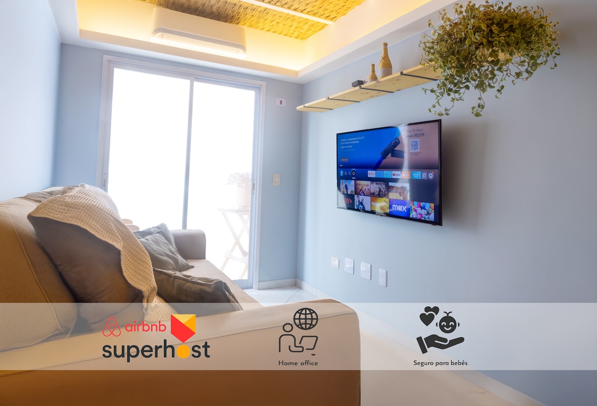 Pé na areia, frente total para o mar com varanda: som das ondas, pássaros, paisagem de tirar o fôlego com vista espetacular. Esse é um apartamento da grife "The Perfect View" -- sempre vistas perfeitas com estilo. A varanda é integrada com uma ampla sala, com vista para o mar. Decorado com design exclusivo oferecendo experiencia única para relaxar ou trabalhar à distância -wi-fi de alta velocidade , ar condic. em todos os cômodos, smart TVs e home office. Uma vaga na garagem com manobrista.