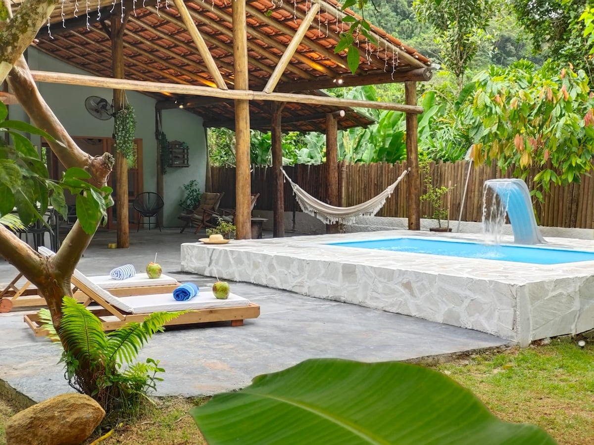 Sip a refreshing glass of the natural spring water, then take a dip in the secluded natural pool at this nature-inspired, architectural masterpiece in the forest's heart. Pick bananas, look for monkeys and watch blue butterflies fluttering by too. Located in Aldeia Rizoma ecological condominium (15-25 min from Paraty dowtown), the house is very comfortable, fully equipped and with Starlink internet connection.