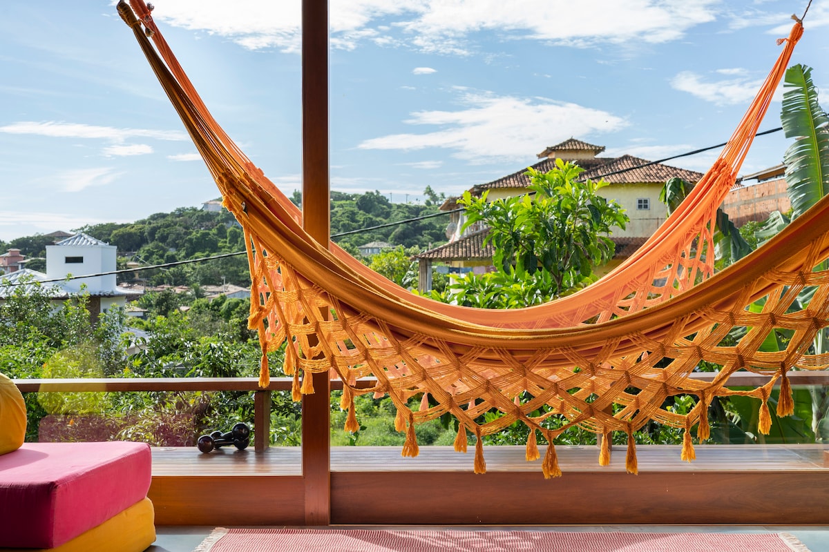 Casa tipo loft com cozinha jardim interno 2 suites 1 no primeiro andar com varanda e a 2 no terreo intrgada no loft com divisorias em tecido. sala ampla com mesa para 12 pessoas , 3 sofas espaçosos. Varanda coberta no jardim interno com mesa de jantar, churrasqueira portatil e ducha. Cozinha toda equipada com utensilios para 6 pessoas. Area de serviço com tanque e varal de roupa. um espaço escritorio com otima conecçao internet. Tudo decorado no estilo Balines. A piscina é compartilhada.