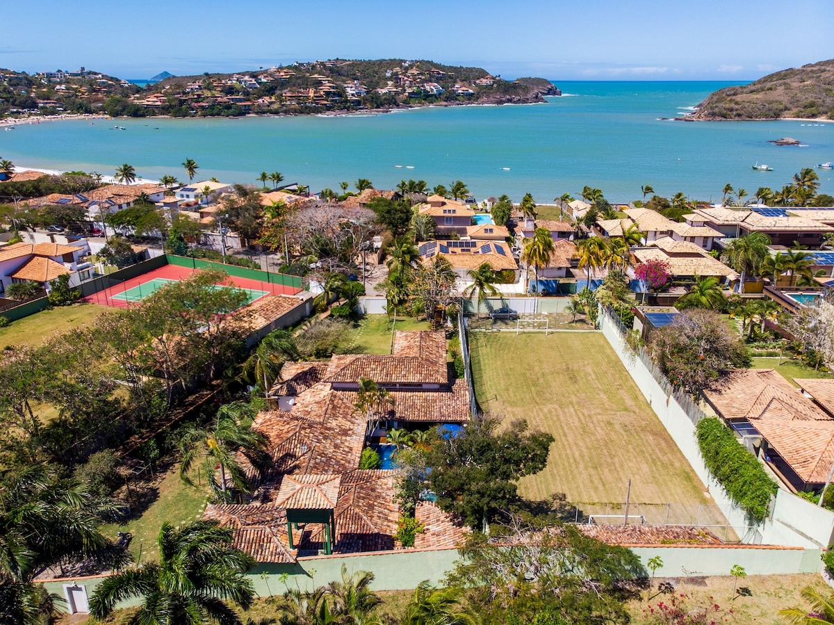 Mansão Luxuosa de Búzios , com 540 metros de área construída , terreno de 4.000 metros quadrados . Cinco quartos muito espaçosos com suíte e um quarto com cama home office . Sala de estar e jantar, lavabo, adega, cozinha, área de serviço , área de lazer com churrasqueira, piscina, banheiro completo área externa . Possui spa e sala de musculação e esteira . Linda jardinagem . chuveiro externo , 05 vagas garagem. Todos os quartos com ar condicionado. Sala de estar E de TV com ar condicionado.