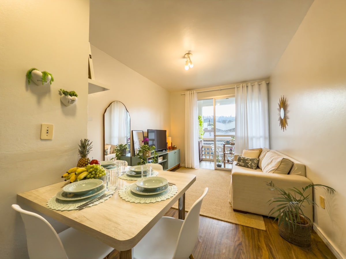 Reformado recentemente e decorado com charme, esse apartamento fica a passos do mar entre Jurerê Tradicional e Canajurê, em condomínio seguro e tranquilo. Ideal para quem busca sossego com acesso rápido ao agito de Jurerê Internacional. O espaço conta com quarto climatizado com ar‑condicionado, Smart TV, internet rápida e vaga privativa no condomínio. A decoração moderna, com toques da cultura local, cria uma atmosfera acolhedora e autêntica — perfeita para relaxar ou explorar a Ilha!