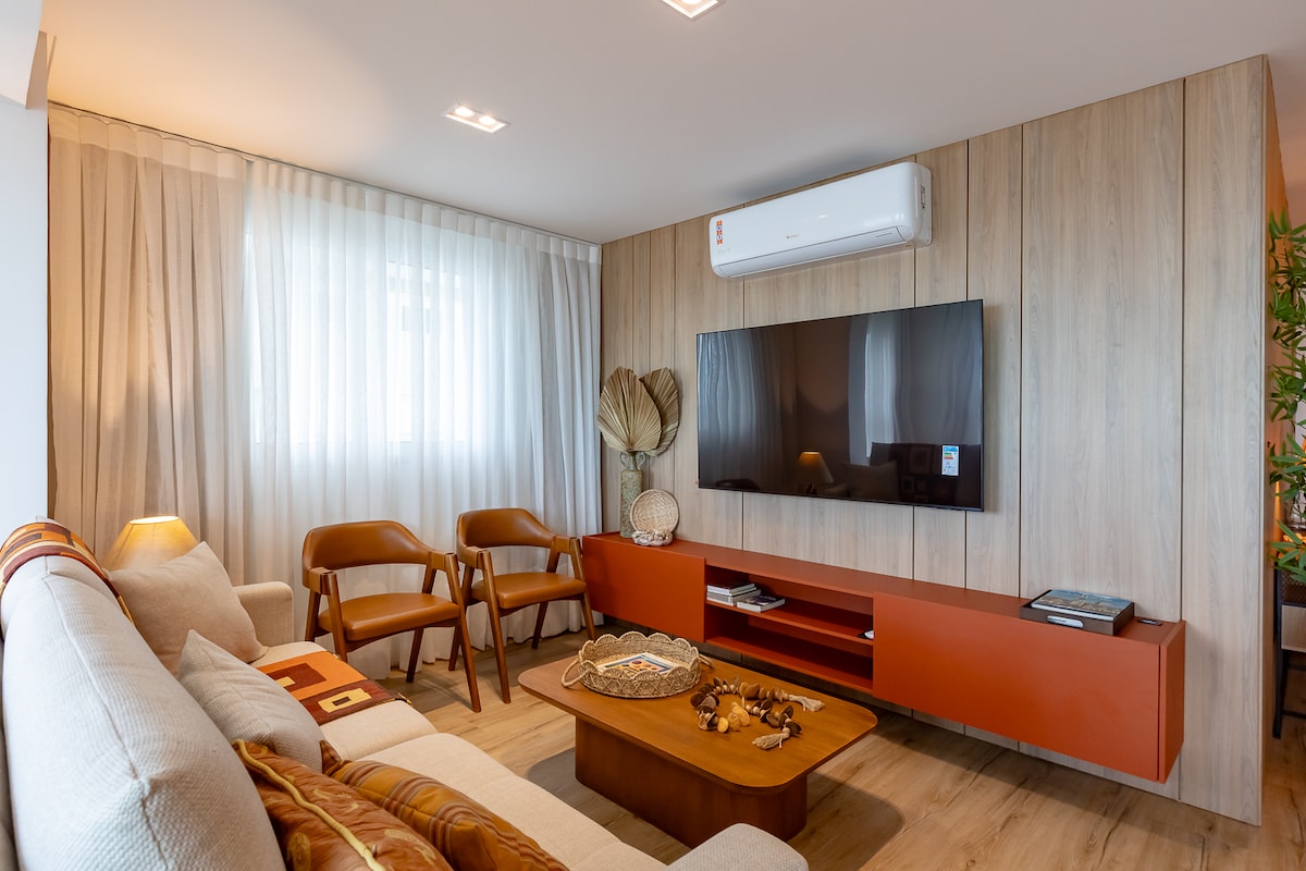 Lounge Apartment, located in Brava Beach and 10 minutes from Balneário Camboriú. The location is perfect. Only 5 blocks from Beach. Close all parties and restaurants. Condo with complete infra, Pool, Gym, Steam and 4 Barbecues.     The apartment has Mountain-facing Jacuzzi with hydro and chromotherapy. Ideal for relaxing or take a romantic time. It has 58 'smart TV in the living room and 40' in the bedroom. Full kitchen. Machine washes and dries.     You will love this place.