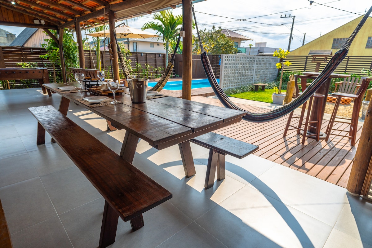 Casa de alvenaria, única no terreno, totalmente cercada com portão eletrônico, apenas 750 metros da praia. Área de lazer incrível, com vista para a Lareira, Piscina e Jardim. - 20 km do parque BETO CARRERO WORLD - 27 km do Aeroporto Navegantes - 40 km de Balneário Camboriú Supermercado, padaria, açougue, bares, restaurantes, farmácia em um raio de +/- 300 metros. - ESTACÃO DE RECARGA PARA VEÍCULOS ELÉTRICOS há 700 metros.