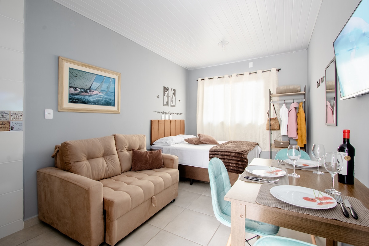 Studio tranquilo, bem ventilado e confortável, ideal para trabalhar home office, ar-condicionado QUENTE /frio, passear e estar na região central de Floripa, no caminho para as melhores praias. Mesa e cadeira de escritório, cozinha, banheiro. Há outros espaços compartilhados, para práticas de Yoga (espaço Casa Aflorar), privilegiada vista para a Beiramar e região, cercada por vegetação nativa, jardins. Internet fibra, airfryer, cortinas black-out.Academias de musculação próximas,ciclovias.