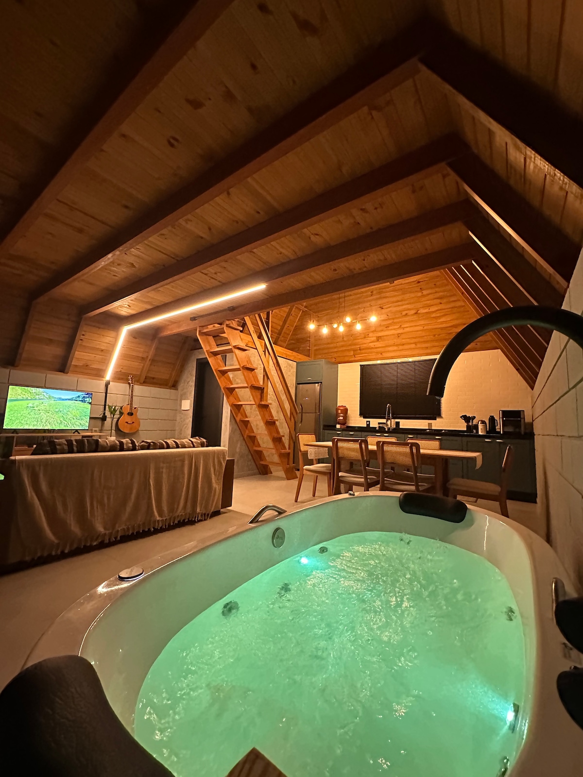 Cabana Vista da Lagoa – Refúgio romântico com vista espetacular em Garopaba A cabana foi pensada especialmente para casais e oferece todo o conforto que você merece. No piso térreo, você encontra uma cozinha compacta e completa, banheiro privativo, televisão, sofá espaçoso, uma lareira ecológica para os dias frios e uma banheira perfeita para relaxar. No mezanino, o quarto conta com uma cama de casal aconchegante, ideal para noites tranquilas em meio à natureza e uma vista de tirar o fôlego!