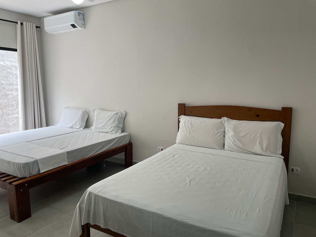 quarto de uma pousada nova que cabem ate 4 pessoas em uma cama de casal e cama solteiro auxiliar a pousada fica a 200 metros da linda praia do guaiuba el Guaruja o.quarto possui banheiro privativo e se pode usar a cozinha da area comum temos umngrande e relaxante patio com redes e rodeado pela natureza com passaros macacos dentre outros a pousada fica de frente para uma mata densa de muito verde e com.varios animas silvestres aproveite para passar días para relajar