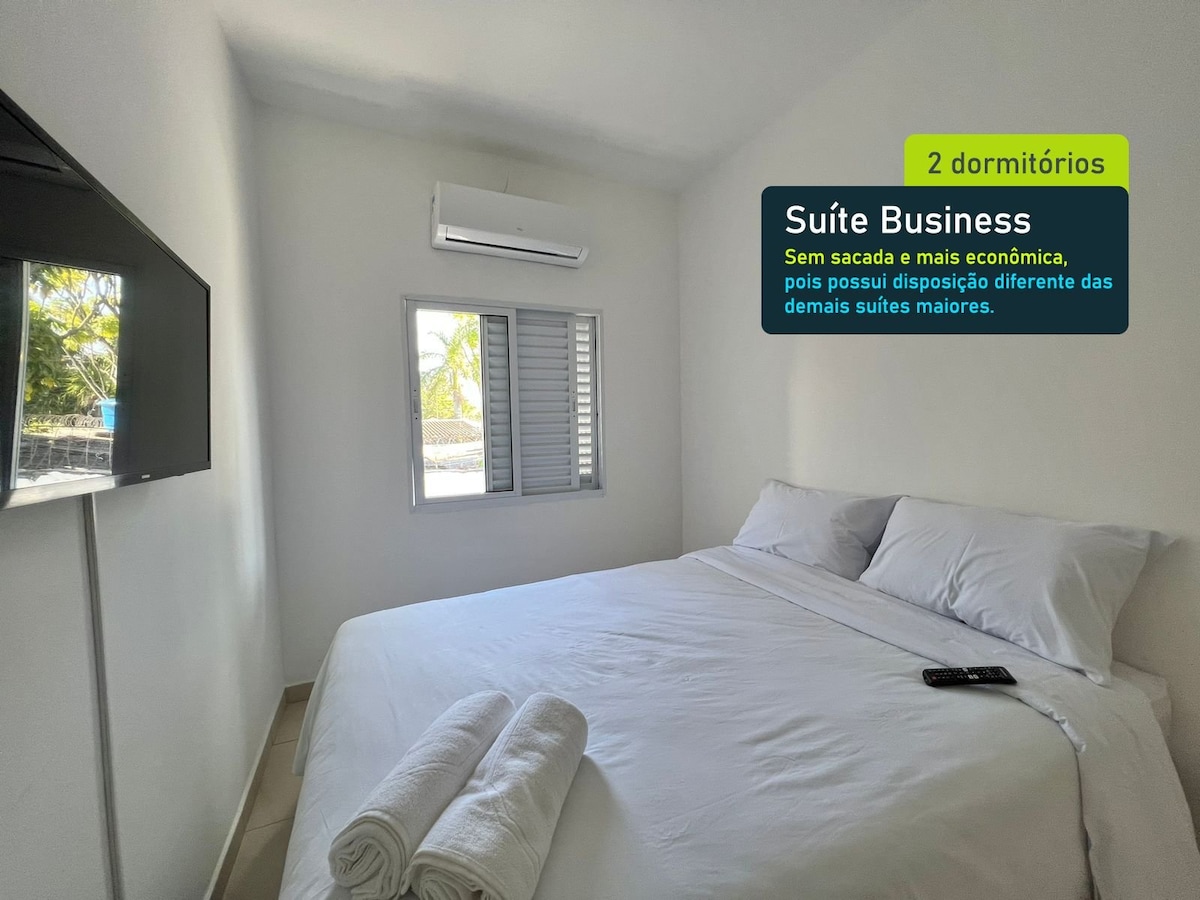 Ampla Suite de com Visão do Mar em todos os locais, inclusive deitado na cama. Possui SPA / Hidro para 6 Lugares também com vista ao Mar , Lareira Elétrica, Frigobar, Secador, Maquina de Café, Sofa Cama, Smartv 42, Mesa para Home. Tudo isto pé na areia em um ambiente único. Estamos localizados no canto da praia, com a construção erguida sobre as rochas da montanha, uma vista única da Praia do Guaiuba. Ainda temos piscina compartilhada e estacionamento aos hospedes.