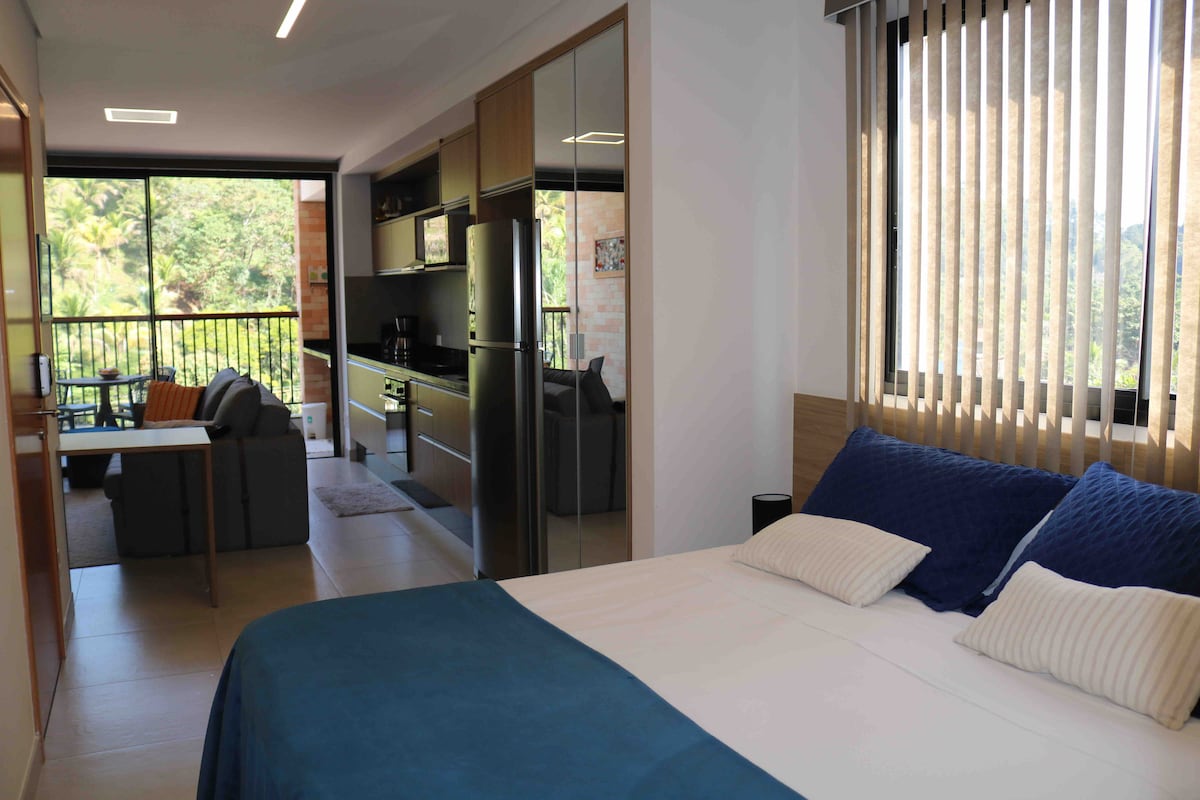 Lindo lugar Condomínio novo. Studio com móveis, eletrodomesticos, Enxoval Completo e de qualidade, Varanda gourmet. Área de lazer completa na cobertura (piscina com borda infinita, saunas seca e Úmida, academia e brinquedoteca. A vista da área de lazer é espetacular! Você pode acessar a praia do Flamengo ou Sete Fontes por trilha, se preferir vários passeios de Escuna ou barco, tudo isso disponível a menos de 200 metros do Condomínio. Não perca esta oportunidade.