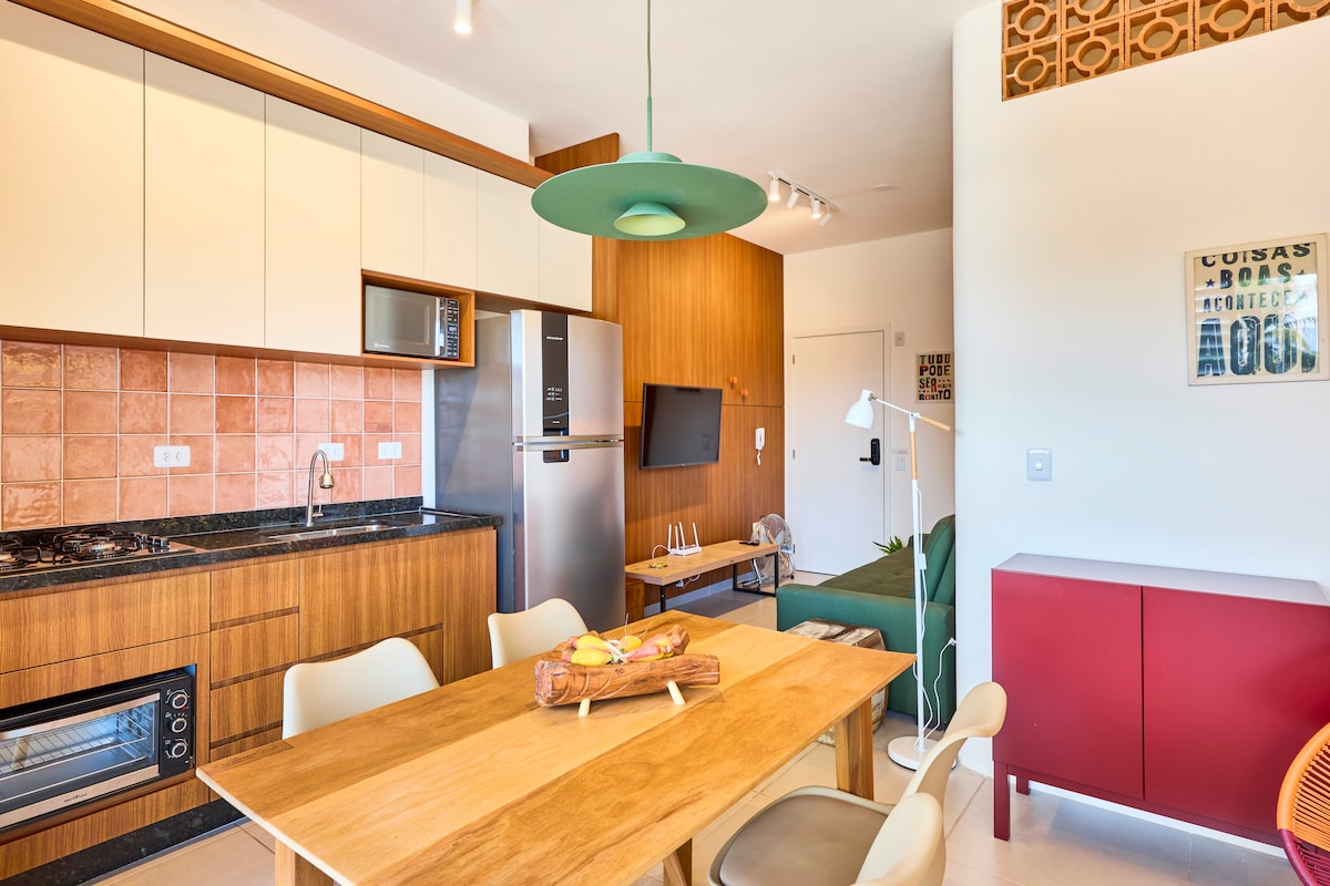 Welcome to a piece of paradise in the best area of Praia Grande. Fiji Residential Condominium offers great leisure facilities, just meters from the sea and near an Atlantic Forest reserve. The apartment is new and modern, with air conditioning, custom furniture, and a full kitchen. Located on the 4th floor, it has a balcony overlooking the pool. It includes a private covered parking space and accommodates up to 4 people — two in the double bed and two on the sofa bed.