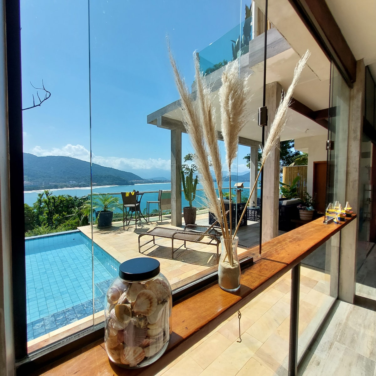 The house is a cozy retreat with a welcoming style, offering breathtaking views from every room. Located in the upscale Ponta das Toninhas condominium with beach access, it features 5 bedrooms, including 4 suites with air conditioning and Smart TVs, plus 1 bedroom with two single beds. Enjoy an infinity pool, steam sauna with glass walls and pool access, barbecue area, beer cooler, and a spacious, fully equipped kitchen with beautiful natural stone details.