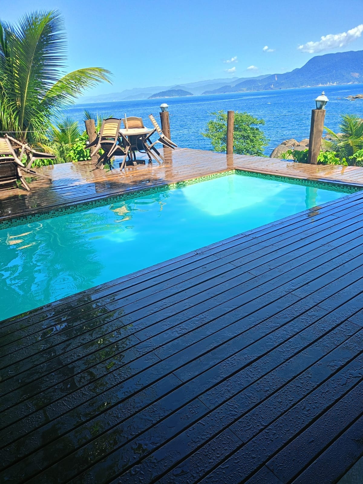 Casa rústica com piscina próxima à praia do Julião, 3 dormitórios com ar condicionado, ventilador de teto ou chão, sendo uma suíte, sala de jantar e de estar, cozinha, churrasqueira, sauna seca e estacionamento, com vista para o canal de Ilhabela. Observações: Dois quartos e 1 banheiro estão localizados no andar térreo com acesso externo ao andar dos cômodos principais. Condomínio fechado com porteiro diurno e portão eletrônico noturno. Guarda sol, 6 cadeiras e carrinho disponíveis para uso.