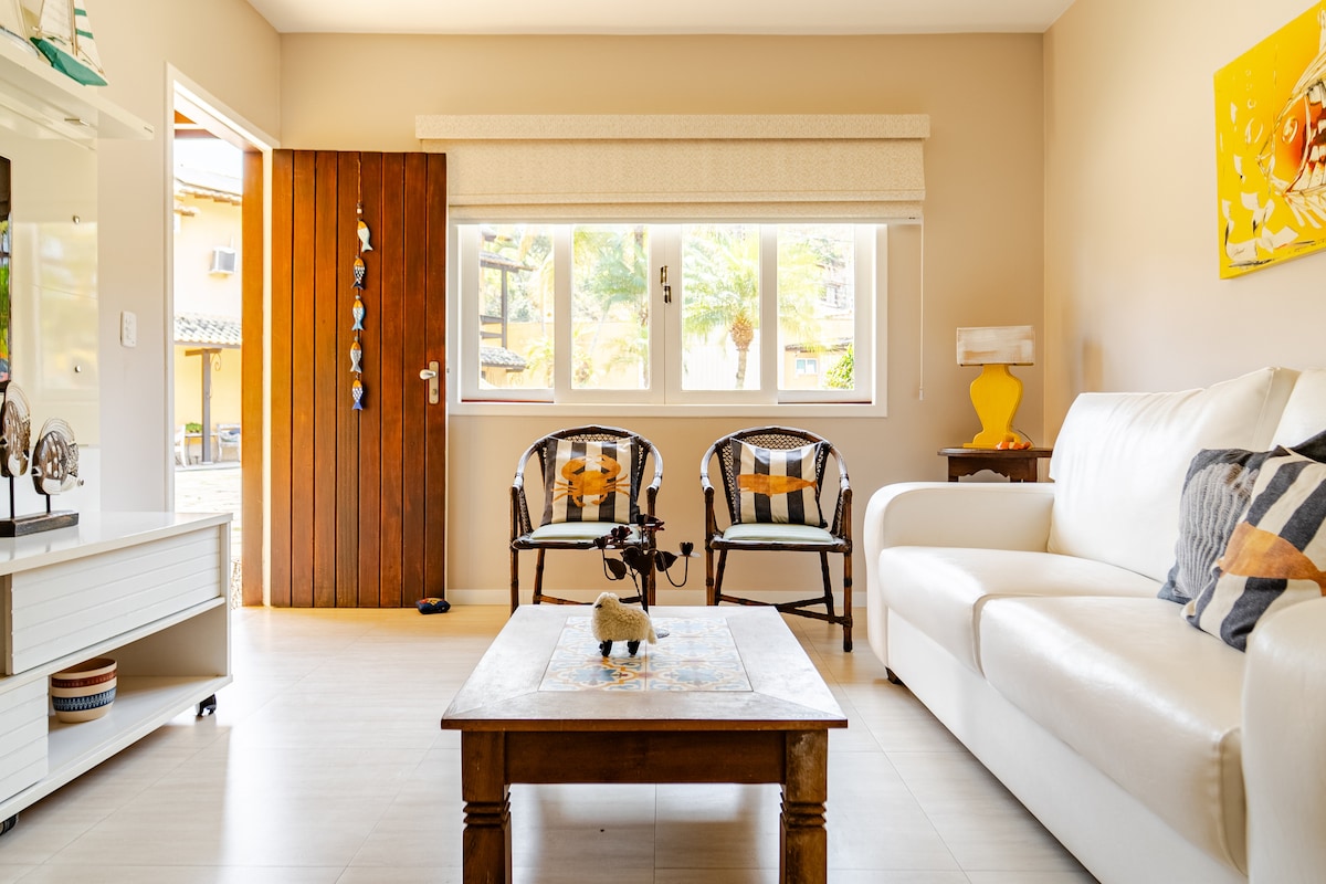 🏖️ Casa 03, Refúgio em Geribá – A 5 Minutos da Praia Mais Desejada de Búzios! 🌴✨ Casa charmosa, acomoda até 6 pessoas com conforto. São 2 quartos com ar-condicionado, 2 banheiros, sala com cozinha americana equipada, terraço gourmet com churrasqueira e varanda. Pet friendly, perfeita para famílias! Condomínio com estacionamento com portão elétrico, piscina, salão de jogos e muito verde. A 4 km da Rua das Pedras. Ideal para relaxar e curtir o melhor de Búzios!