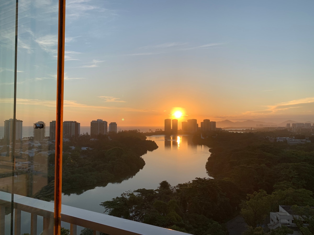 Divirta-se com a família no flat finamente decorado na Barra da Tijuca, localizado no condomínio Barramares, em frente à praia, no Posto 4. Flat projetado por arquiteta, todo mobiliado, internet banda larga, split no quarto, Smart TV, cozinha compacta e equipada e varanda com uma rede pra relaxar O prédio, em sua cobertura, possui incrível vista panorâmica, piscinas aquecidas, academia, sauna seca e vapor , segurança 24h, vaga de garagem, além de disponibilizar cadeiras para uso na praia