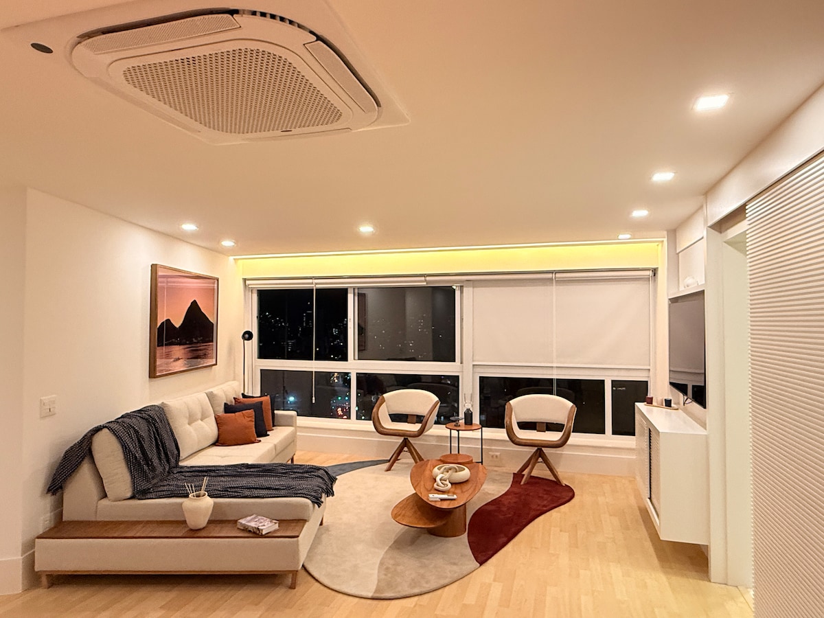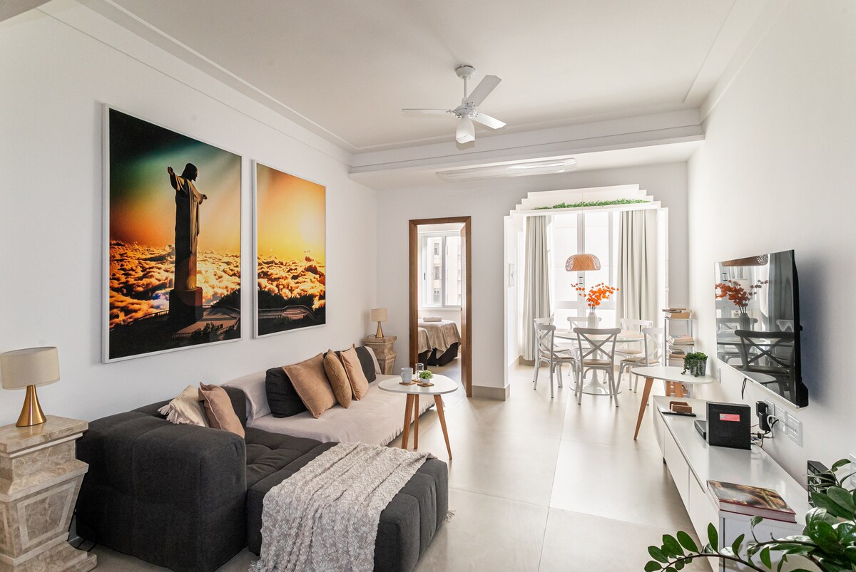 Boho chic style apartment, on the Copacabana beach! - Queen bed, sofa bed, dining table, air conditioning and space for home office (Wifi 300Mbps). Kitchen with stove, refrigerator, oven, microwave, blender, coffee maker, juicer, sandwich maker, pans, kitchen utensils, various books, guitar and TV with apps. - Market and pharmacy under the building, restaurants and shops around the apartment. - Airport at 8.3km - Cristo Redentor at 11.5km - Pão de Açúcar at 2.8km