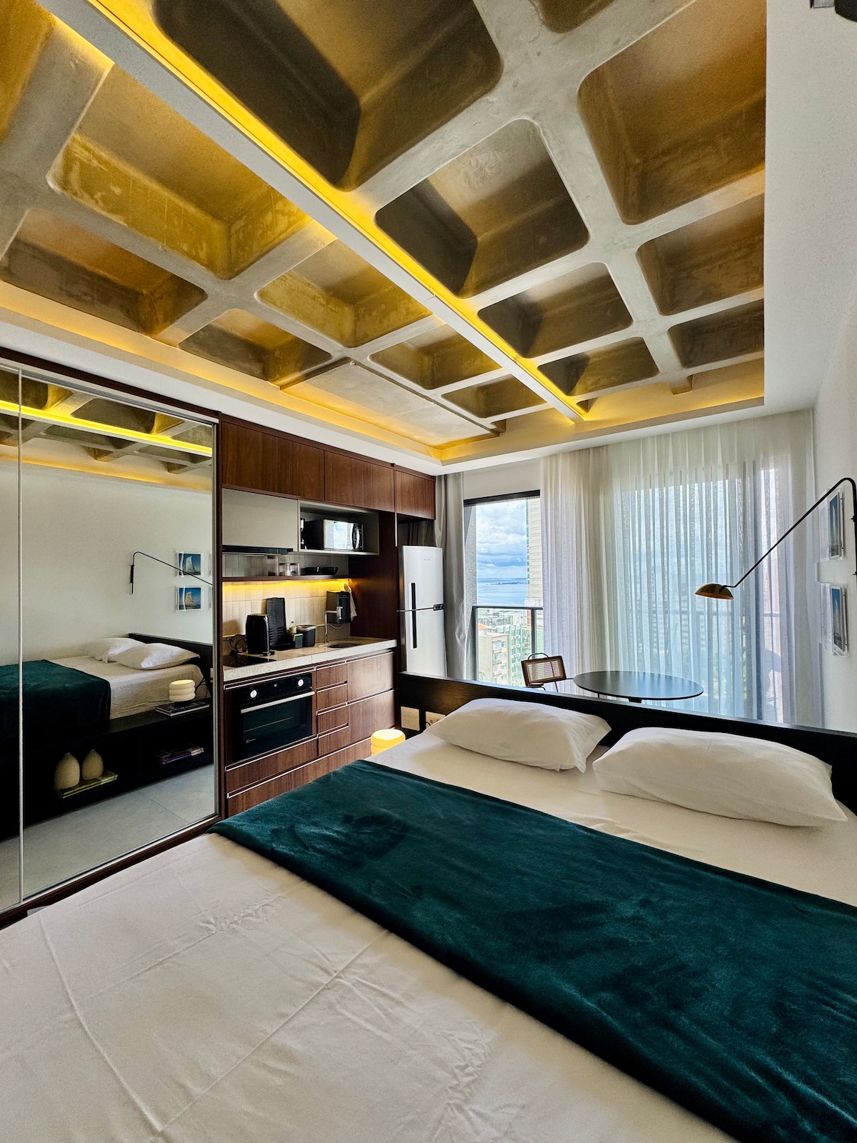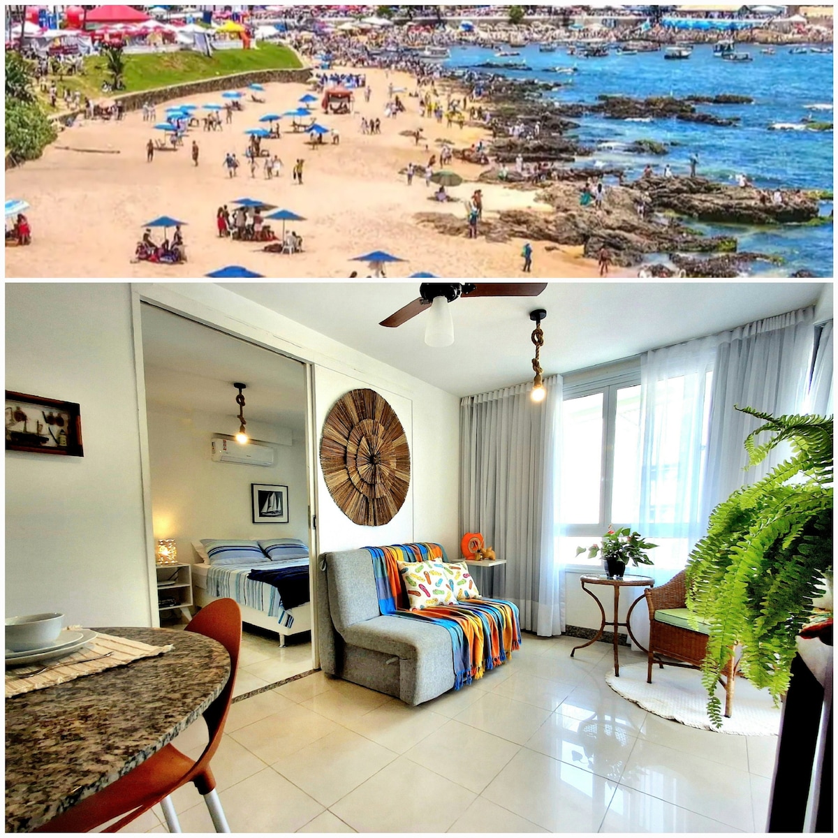 Apart decorado com vista magnífica da Baía de Todos-os-Santos, em Ondina, no circuíto do carnaval, perto do Farol da Barra e Rio Vermelho. Duas suítes com ar, sala, cozinha, Wi-Fi, serviço de camareira, recepção 24h e estacionamento rotativo na frete do Apart. Camas novas, roupa de cama e banho. Smart tv 43, geladeira, fogão, sofá-cama, micro-ondas, liquidificador, sanduicheira, cafeteiras: nespresso e arno e utencílios de cozinha. Piscinas, bar, padaria, retaurantes, lojas, galeria e salão.