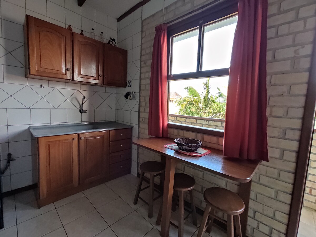 As kitnets têm cozinha compacta, equipada com fogão de 2 bocas, geladeira e utensílios básicos. Possuem beliche e cama auxiliar embaixo, e subindo as escadas, uma suíte casal com ar condicionado e SmartTV.