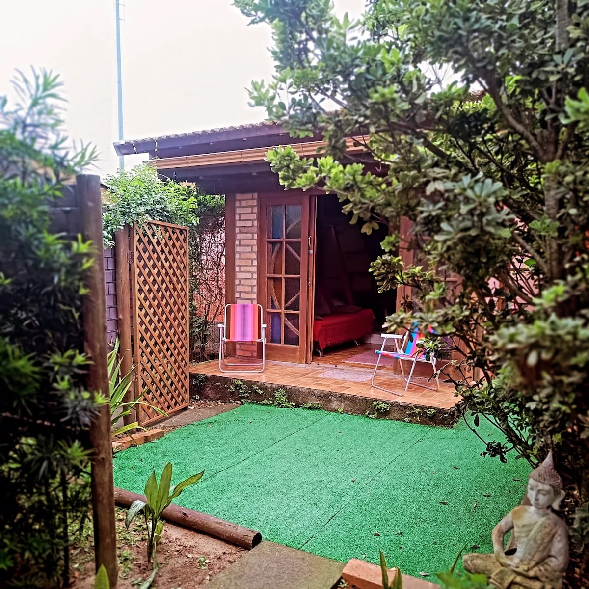 Relaxe nesta acomodação tranquila com acesso direto à praia. Atelier de arte transformado em acomodação ideal para duas pessoas (cama auxiliar para 3ª). Anexo a casa familiar localizada dentro de condomínio fechado, com portaria 24hs, câmeras de segurança, playground, bosque e campinho de futebol. Espaço equipado com frigobar, fogão, forninho elétrico, cafeteira. Acesso direto à praia por trilha ecológica por dentro do Parque das Dunas. Caminhada 1,5km por deck, bosques, dunas e lagoas.