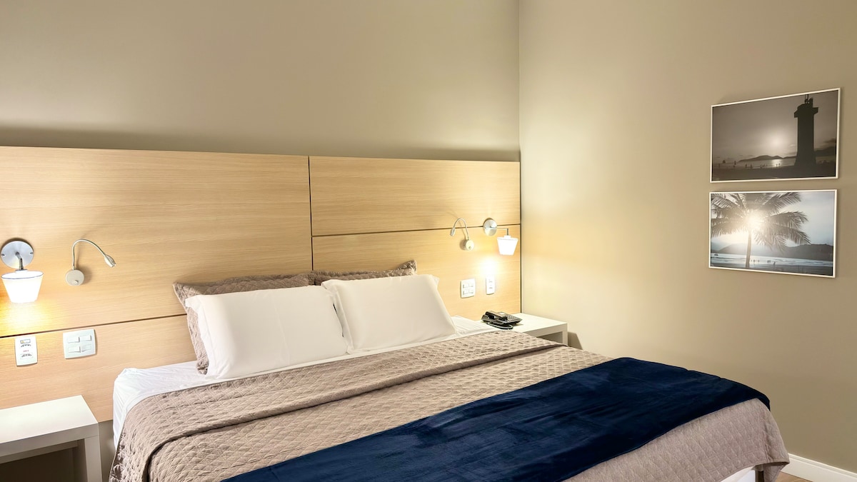 Apartamento mobiliado, apenas 230 metros da praia, menos de 3 minutos a pé. Roupa de cama, toalhas, ar condicionado, TV a cabo, wi-fi, cofre digital, secador de cabelo. Acomoda confortavelmente 4 pessoas, com uma cama de casal no quarto e um sofá cama na sala. Para maior conforto, o Flat conta com recepção 24 horas facilitando o check-in ou check-out, excelente café da manhã (pago a parte), piscina, academia e limpeza diária, exceto domingos e feriados.