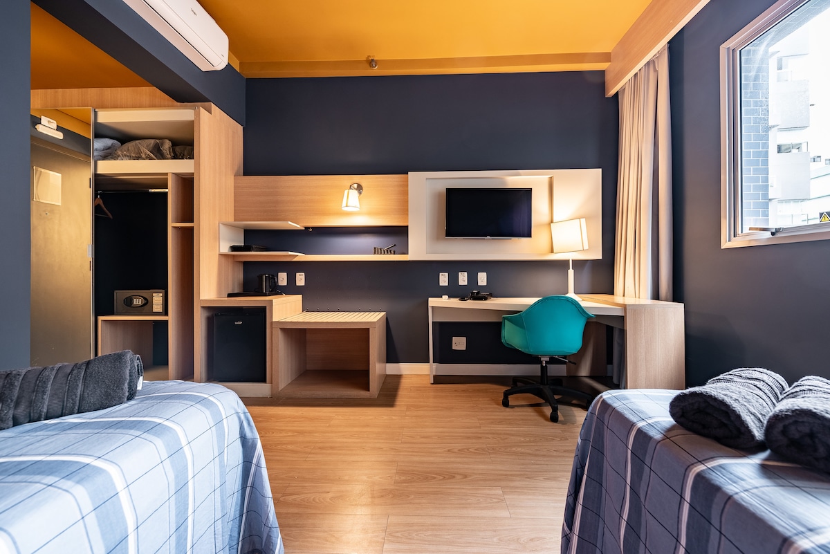 BEACHFRONT Studio in José Menino, Santos, SP. SIDE SEA VIEW. HANGING BED. CLIMBING WALL. Comfortably accommodates 2 adults (queen-size bed) and 2 children (double-size bed). :. 350-megabyte Wi-Fi :. Hot/cold air conditioning :. 32-inch Smart TV :. Electronic lock :. Kitchen (filter, refrigerator, cooktop, microwave, Nespresso machine, mixer, and pots) :. Washer/dryer :. Window screen :. Outlet protectors :. 220V voltage :. Rotating parking space, subject to availability.