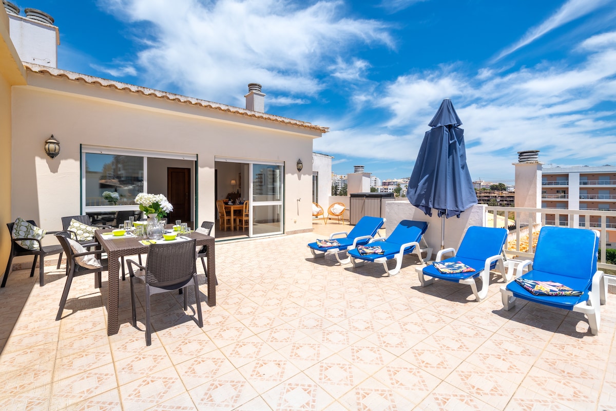 Siete i benvenuti in questo stupendo attico appena rimodernato (agosto 2019) su due piani in cima a uno dei più alti palazzi fronte mare. Godrete di una vista spettacolare sulle spiagge, sulla passeggiata e sul caratteristico paese di Armação de Pêra. La posizione assolutamente favorevole all'inizio dell'isola pedonale vi permetterà sia piacevoli passeggiate lungo costa sia di attraversare la strada e accedere direttamente alla spiaggia libera.