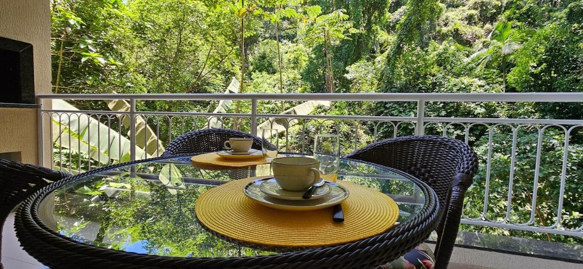Apartamento com linda vista de Bombinhas, Bombas e Porto Belo. Apto de 1 quarto (casal - cama queen size), cozinha completa, banheiro, sala e sacada c/rede. Moderno, decoração clean, ar condicionado e TV led. A propriedade possui pátio, piscina, churrasqueiras e há 1 vaga de estacionamento (compartilhados). Ficamos 5min a pé das praias: Lagoinha, Sepultura e Retiro dos Padres, zona tranquila e segura, 15 min a pé do centro de Bombinhas. Acesso a cobertura por escadas.