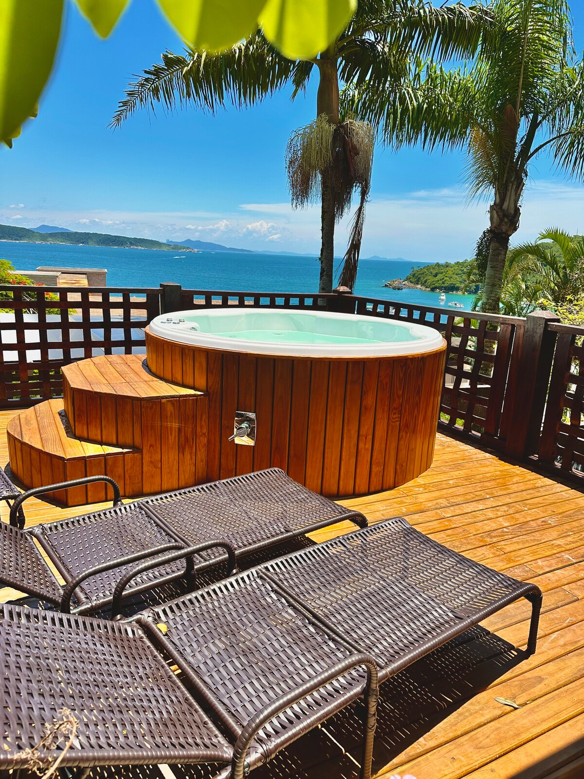 Vista para o mar com varanda e churrasqueira.