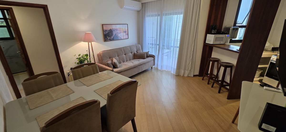 Hey! We are Henrique and Letícia, and this is the Suíte Tranquilidade, or “Tranquility Suite”, our apartment located 50 meters from the promenade of Praia de Icaraí, and a few meters from all the important services for your stay, such as pharmacies, bakeries and restaurants. Our Suite is a "studio" type apartment, carefully designed to receive our friends and guests, and can accommodate up to 3 people, with a double bed and a sofa bed.