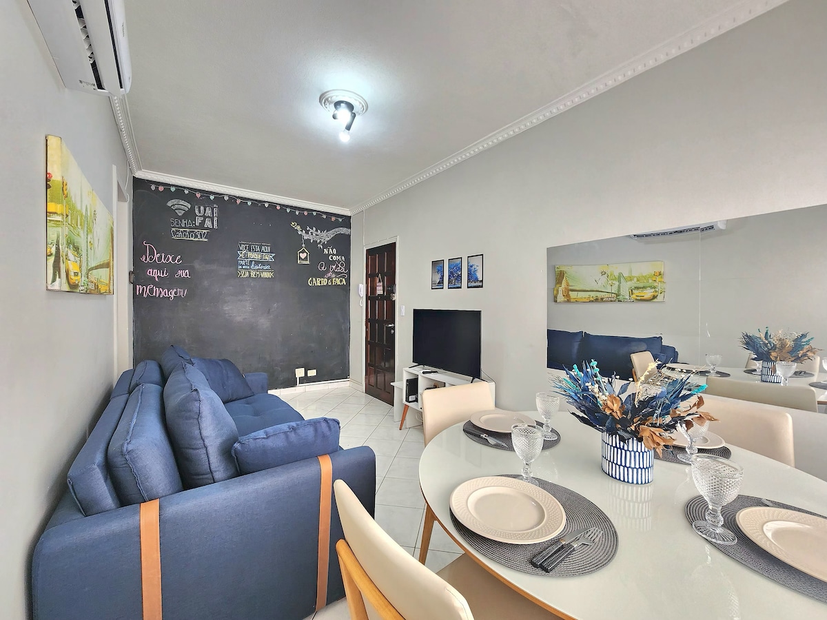 Informações do apartamento: - Comporta até 5 hóspedes. - Ar condicionado e sacada nos quartos. - Cozinha completa. - Uma vaga na garagem do prédio. - Fechadura eletrônica. - Todas as janelas são teladas. - Piscina e salão de jogos do condomínio. - Fornecemos roupa de cama e banho. - Pets são aceitos. - TV 4k e Wi-Fi de 220 Mbps. - 100m da praia da Vila Tupi. - A uma quadra de um mercadinho, duas quadras de uma padaria, além de diversos restaurantes a poucas quadras de distância.